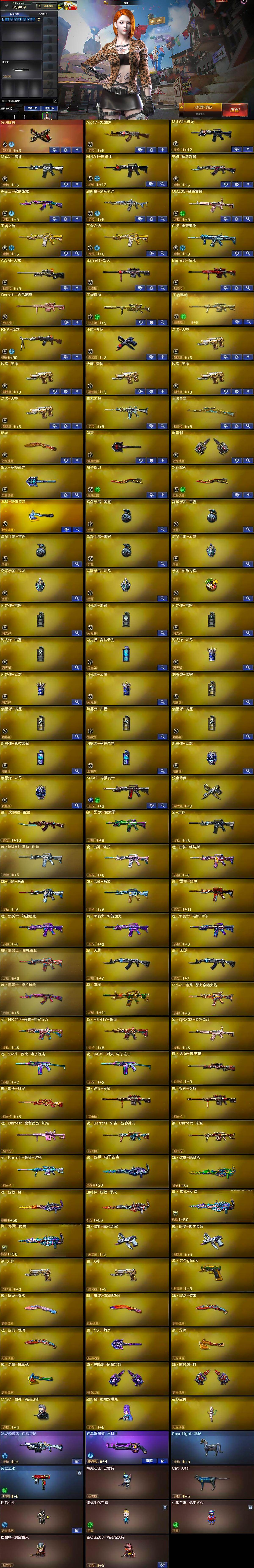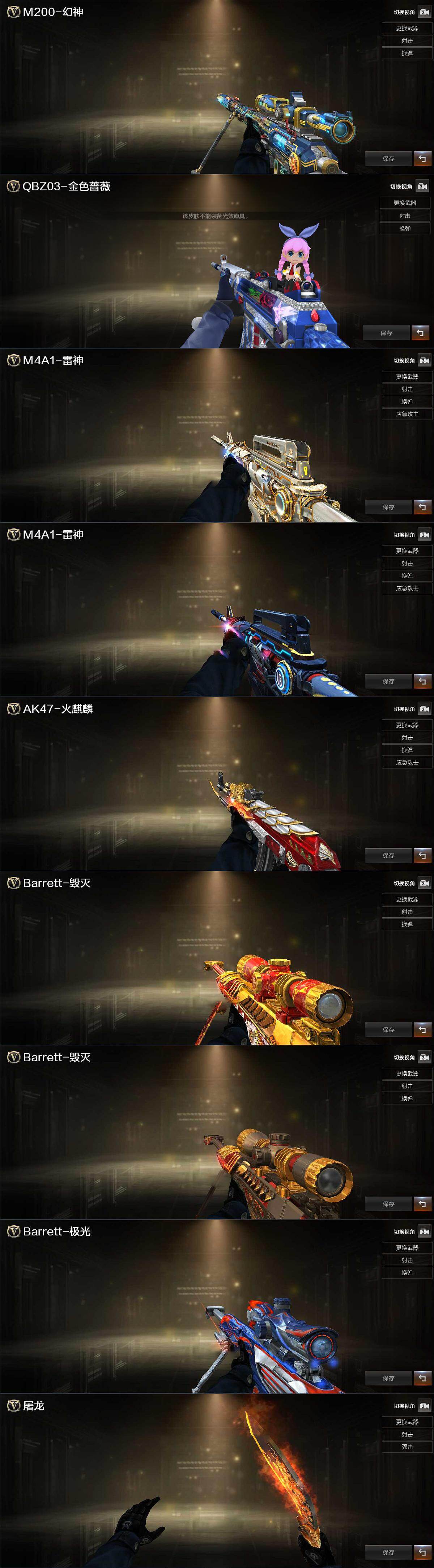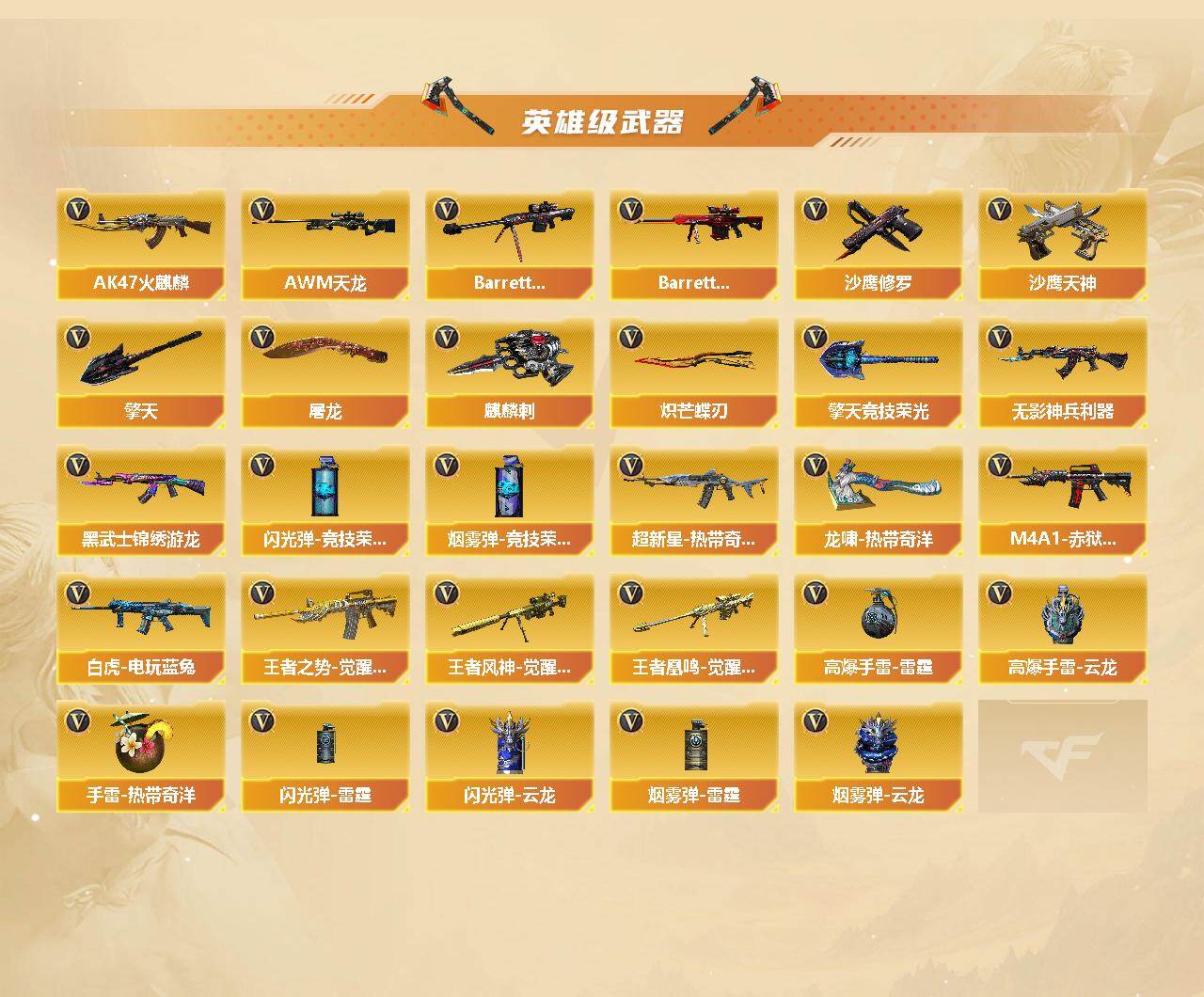 【英雄级武器】:AK47-火麒麟,M4A1-黑龙,M4A1-雷神,M4A1-黑骑士,无影-神兵利器,黑武士-锦绣游龙,超新星-热带奇洋,QBZ03-金色蔷薇,王者之势-觉醒版*2,白虎-电玩蓝兔,AWM-天龙,Barrett-毁灭,Barrett-极光,Barrett-金色蔷薇,王者风神-觉醒版,王者凰鸣-觉醒版,RPK-盘龙,沙鹰-修罗,沙鹰-天神*5,屠龙,擎天,麒麟刺,擎天-竞技荣光,炽芒蝶刃*2,龙啸-热带奇洋,高爆手雷-雷霆*4,高爆手雷-云龙*3,手雷-热带奇洋,闪光弹-雷霆*4,闪光弹-竞技荣光,闪光弹-云龙*3,烟雾弹-雷霆*4,烟雾弹-竞技荣光*2,烟雾弹-云龙*2,M4A1-赤狱骑士