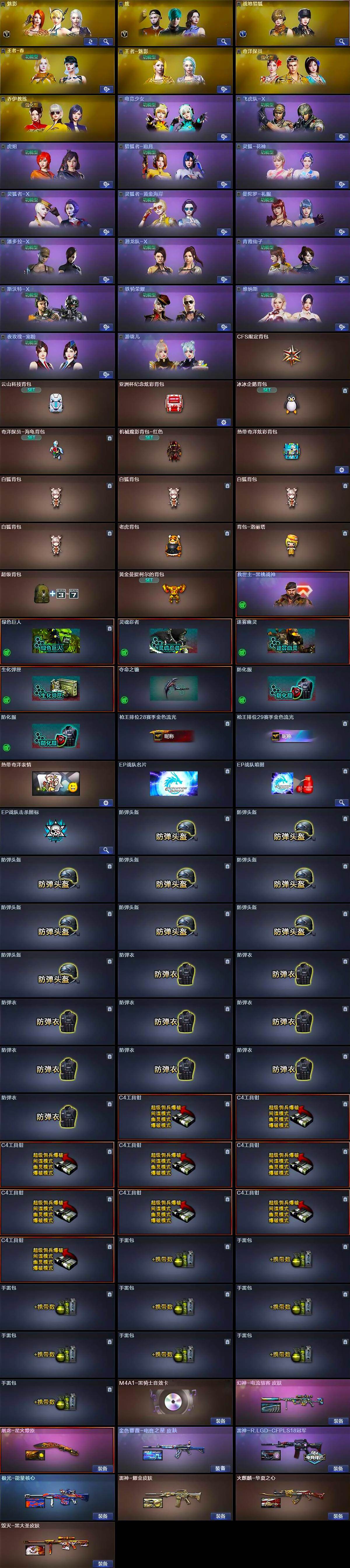 【道具】:CFS限定背包,云山科技背包,亚洲杯纪念炫彩背包,冰冰企鹅背包,奇洋探员-海龟背包,机械魔影背包-红色,热带奇洋炫彩背包,白狐背包*4,老虎背包,背包-洛丽塔,超级背包,黄金曼提柯尔的背包,救世主-黑桃战神,绿色巨人,灵魂忍者,迷雾幽灵,生化弹匣,夺命之镰,防化服*2,枪王排位28赛季金