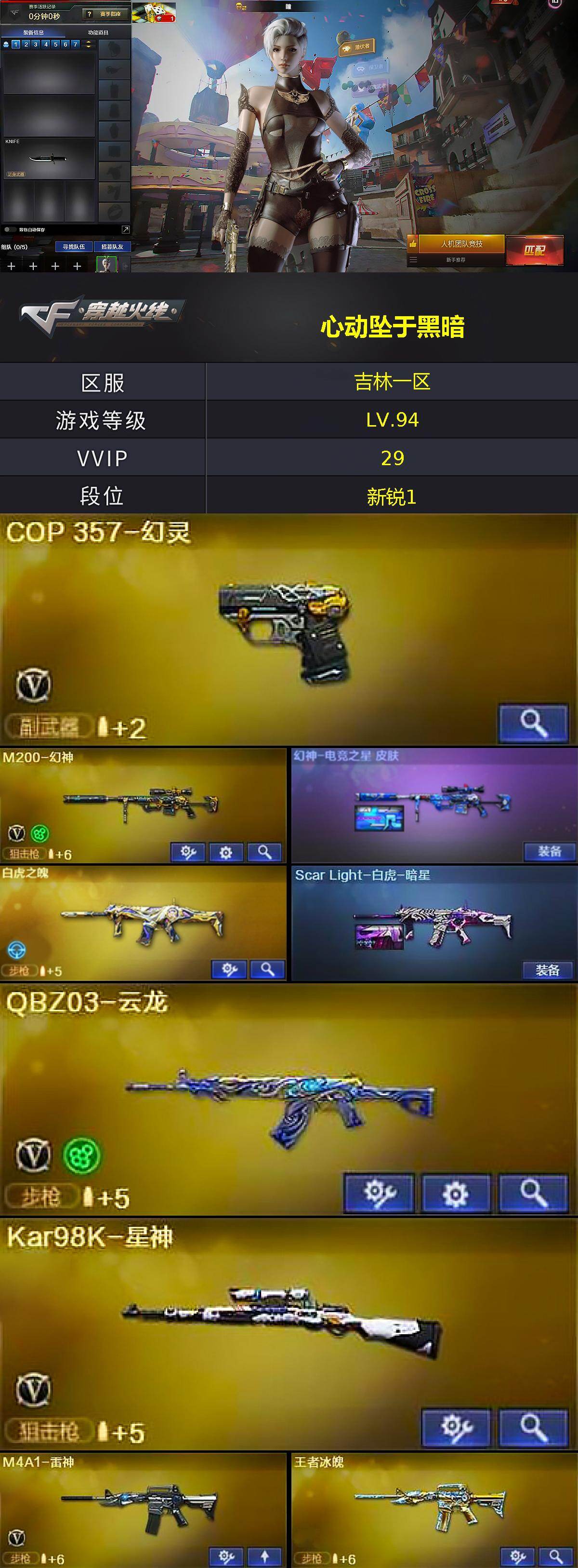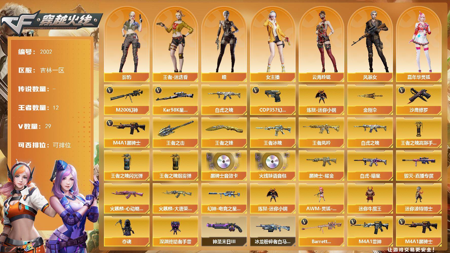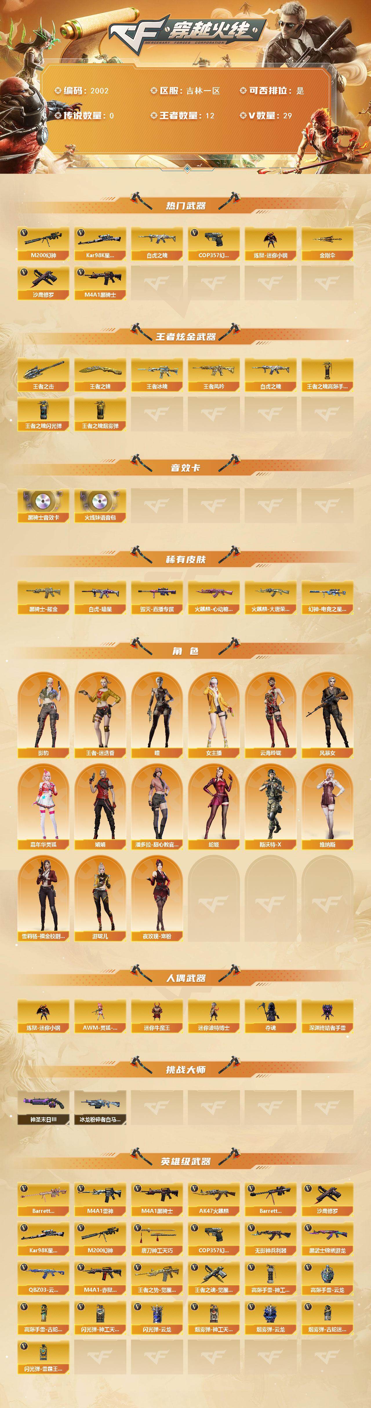 [16535179]吉林一区-33V-12王者武器数-0炫金武器数 【热门武器】:M200-幻神,白虎之魄,Kar98K-星神,炼狱-迷你小钢,M4A1-黑骑士,COP 357-幻灵,沙鹰-修罗,金刚伞 【王者炫金武器】:王者冰魄,王者凤吟,白虎之魄,王者之击,王者之锋,王者之魄高爆手雷,王者之魄闪光弹*2,王者之魄烟雾弹 【音效卡】:M4A1-黑骑士音效卡,火线妹语音包 【皮肤】:幻神-电竞之星 皮肤,Scar Light-白虎-暗星,火麒麟-大唐荣光,火麒麟-心动糖果,毁灭-直播专属,黑骑士耀金皮肤 【角色】:瞳,影豹,王者-迷迭香,云海玲珑,风暴女,嘉年华灵狐,娟娟,女主播,潘多拉-甜心教官,蛇姬,斯沃特-X,维纳斯,雪莉杨-摸金校尉,夜玫瑰-宠粉,游珑儿 【人偶武器】:炼狱-迷你小钢,AWM-灵狐-15周年嘉年华,迷你牛魔王,迷你波特博士,夺魂*2,深渊终结者手雷 【挑战大师】:冰龙粉碎者-白马银枪,神圣爆裂者-末日III*2 【英雄级武器】:AK47-火麒麟,M4A1-雷神,M4A1-黑骑士,无影-神兵利器,QBZ03-云龙,黑武士-锦绣游龙,王者之势-觉醒版,Barrett-毁灭,M200-幻神,Kar98K-星神,Barrett-金色蔷薇,沙鹰-修罗,COP 357-幻灵,王者之魂-觉醒版,唐刀-神工天巧,高爆手雷-神工天巧,高爆手雷-云龙*3,高爆手雷-古蛇迷踪,闪光弹-神工天巧,闪光弹-云龙*2,闪光弹-雷霆王者-觉醒版,烟雾弹-神工天巧,烟雾弹-云龙*2,烟雾弹-古蛇迷踪,M4A1-赤狱骑士 【道具】:CFS限定背包,全能枪王背包,炫彩背包,裂空之翼背包-金色,超级背包,夺命之镰,防化服,金色流光-枪王排位*2,星辰流光-枪王排位,巅峰赛先锋-金色流光,枪王排位28赛季金色流光,枪王排位29赛季金色流光,EP战队名片,EP战队喷图,防弹头盔,防弹衣,C4工具钳,手雷包 【特殊枪械】:1黑骑士