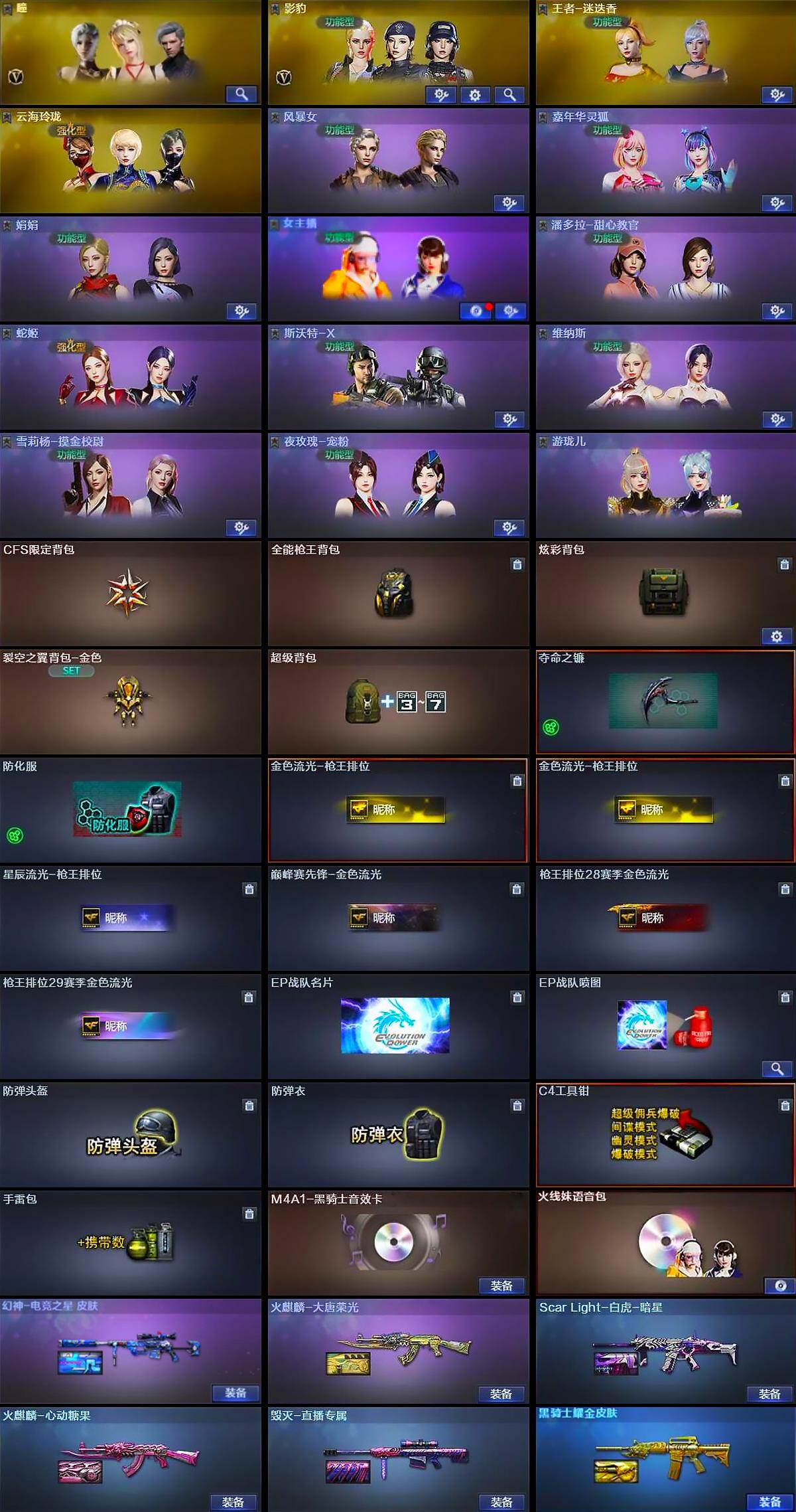 【道具】:CFS限定背包,全能枪王背包,炫彩背包,裂空之翼背包-金色,超级背包,夺命之镰,防化服,金色流光-枪王排位*2,星辰流光-枪王排位,巅峰赛先锋-金色流光,枪王排位28赛季金色流光,枪王排位29赛季金色流光,EP战队名片,EP战队喷图,防弹头盔,防弹衣,C4工具钳,手雷包