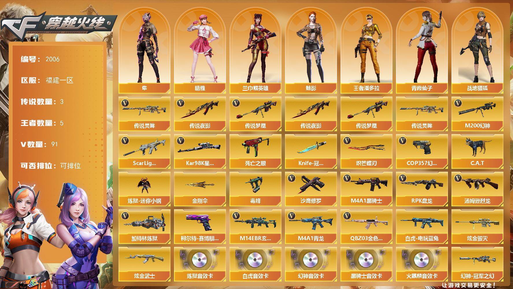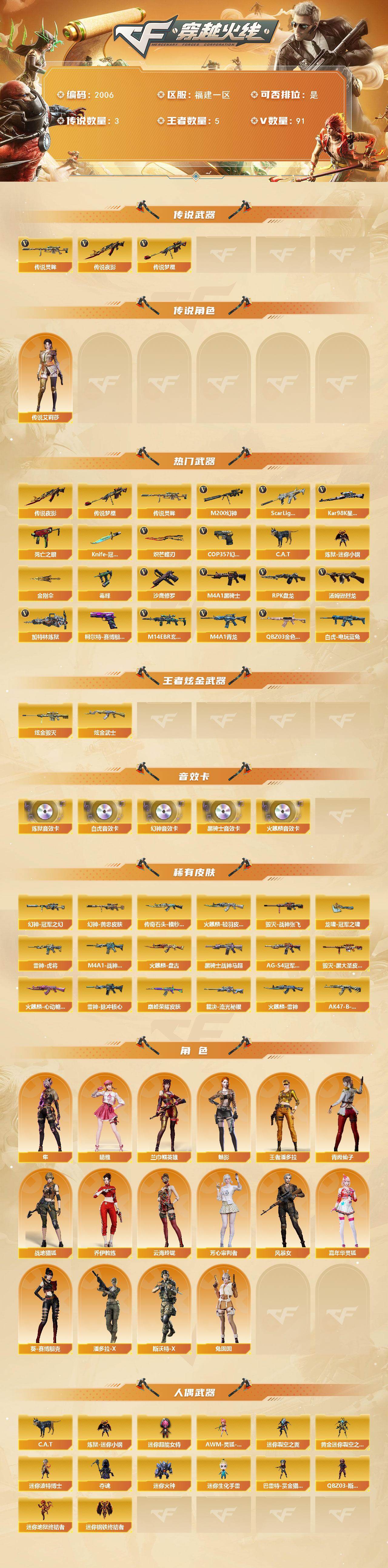 [16535667]福建一区-96V-5王者武器数-2炫金武器数 【传说武器】:传说夜影,传说梦魇,传说灵眸 【传说角色】:传说艾莉莎 【热门武器】:传说梦魇,传说夜影,传说灵眸,QBZ03-金色蔷薇,M14EBR-玄武,Scar Light-白虎,M4A1-青龙,M200-幻神,死亡之眼,白虎-电玩蓝兔,Kar98K-星神*2,C.A.T,炼狱-迷你小钢,毒蜂,M4A1-黑骑士*2,汤姆逊-烈龙*5,RPK-盘龙*5,加特林-炼狱,COP 357-幻灵*2,沙鹰-修罗,柯尔特-赛博朋克*2,Knife-冠军之刃,炽芒蝶刃,金刚伞 【王者炫金武器】:炫金武士,炫金毁灭 【音效卡】:M200-幻神音效卡,AK47-火麒麟音效卡,M4A1-黑骑士音效卡,Scar Light-白虎音效卡,加特林-炼狱音效卡 【皮肤】:M200-幻神-黄忠皮肤,幻神-冠军之幻,QBZ03-巅峰荣耀皮肤,裁决-流光秘银,雷神-虎将,M4A1-战神赵云,雷神-脉冲核心,火麒麟-雷神,火麒麟-轻羽皮肤,传奇石头-横秒之巅,火麒麟-盘古,火麒麟-心动糖果,毁灭-战神张飞,毁灭-黑大圣皮肤,黑骑士-战神马超,黑骑士-AG-S4冠军典藏,AK47-B-常胜将军-刘备,龙啸-冠军之啸 【角色】:魅影,兰-巾帼英雄,晴雅,隼,战地猎狐,王者潘多拉,乔伊教练,云海玲珑,芳心审判者,风暴女,嘉年华灵狐,葵-赛博朋克,潘多拉-X,青霞仙子,斯沃特-X,兔囡囡 【人偶武器】:炼狱-迷你小钢,迷你钢铁终结者,迷你地狱终结者,AWM-灵狐-15周年嘉年华,C.A.T,迷你裂空之翼,黄金迷你裂空之翼,迷你波特博士*4,夺魂,迷你火种*2,迷你生化手雷,巴雷特-赏金猎人,迷你超能女侍,QBZ03-斯沃特 【暴走生化】:毒蜂,死亡之眼 【挑战大师】:冰龙粉碎者-白马银枪*2,激光毁灭者III-白马银枪,VEPR-12-金魔,机甲撕裂者III,试炼破坏者III,KAC-圣炎切割者III,阐释者III 【英雄级武器】:AK47-火麒麟*2,M4A1-雷神,M4A1-黑骑士*2,AK47-黑武士,AK12-天启,AN94-超新星,M4A1-青龙,Scar Light-白虎,M14EBR-玄武,无影-神兵利器,黑武士-锦绣游龙,QBZ03-金色蔷薇,烈火-动感闪耀,AK-47-猩红传说*3,AK47-B-战神*2,白虎-电玩蓝兔,白虎之魄-觉醒版,