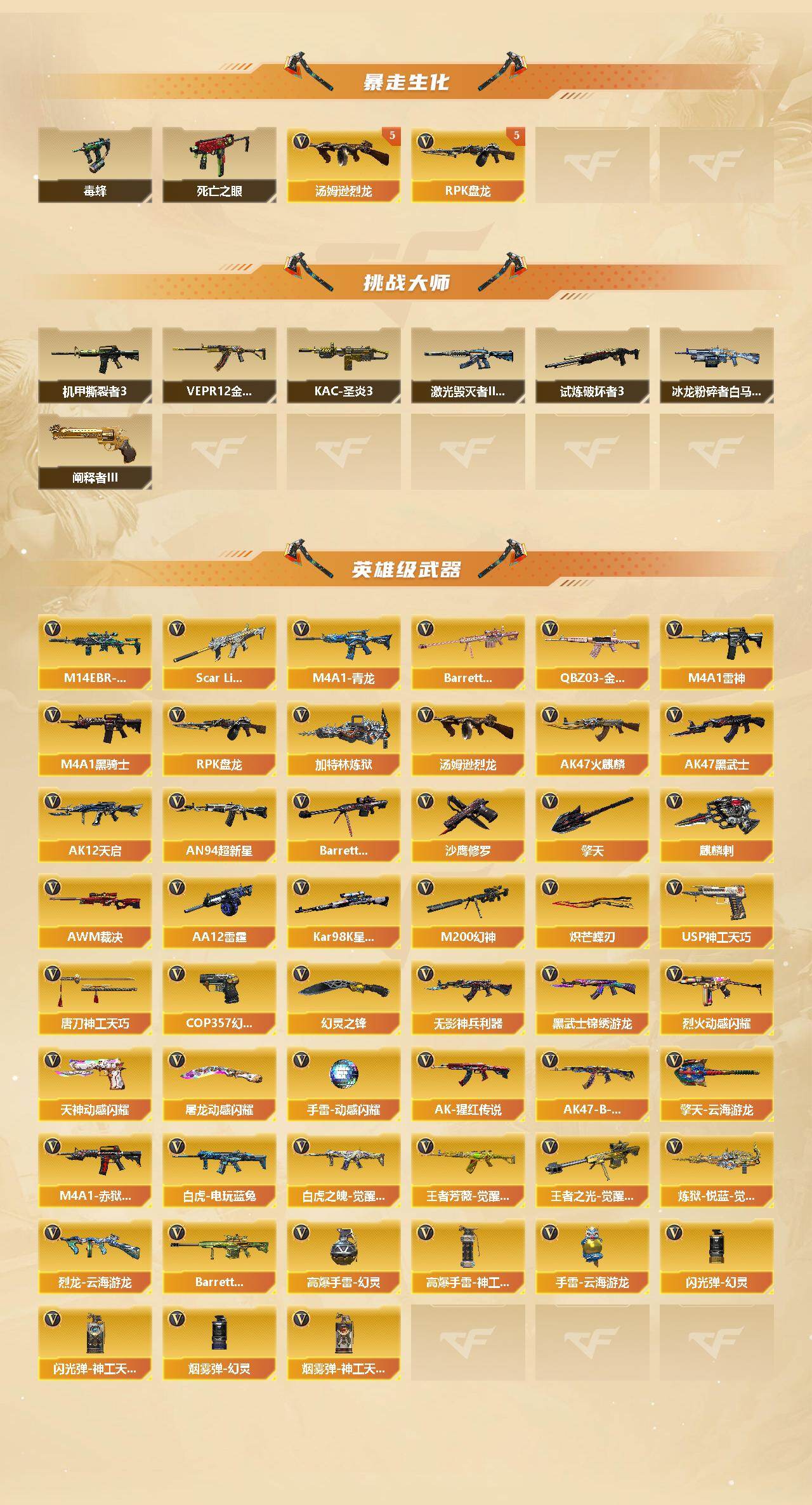 【英雄级武器】:AK47-火麒麟*2,M4A1-雷神,M4A1-黑骑士*2,AK47-黑武士,AK12-天启,AN94-超新星,M4A1-青龙,Scar Light-白虎,M14EBR-玄武,无影-神兵利器,黑武士-锦绣游龙,QBZ03-金色蔷薇,烈火-动感闪耀,AK-47-猩红传说*3,AK47-B-战神*2,白虎-电玩蓝兔,白虎之魄-觉醒版,