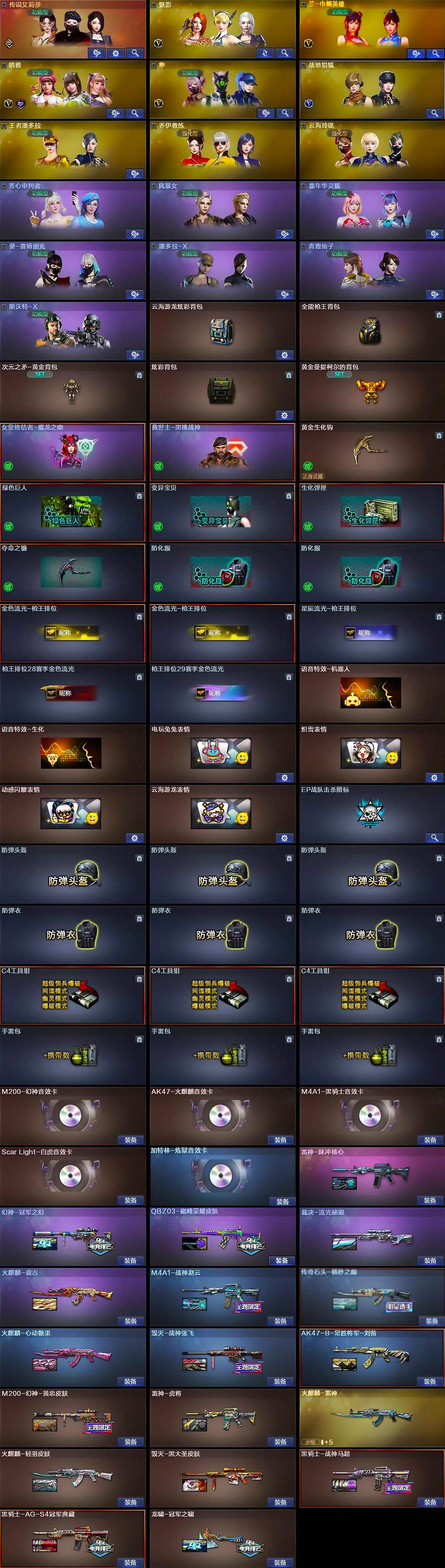 - [14990304]云南一区-53V-10王者-0炫金 【热门武器】:QBZ03-金色蔷薇,Scar Light-白虎,M4A1-青龙,M200-幻神,金色蔷薇-古蛇迷踪,修罗-古蛇迷踪,M200-竞技荣光,八面凌龙,死亡之眼*3,M4A1-黑骑士,羊驼玩偶,沙鹰-修罗 【王者炫金武器】:王者之怒,王者蔷薇,王者之魄高爆手雷,王者之魄闪光弹*2 【音效卡】:M4A1-黑骑士音效卡,Barrett-极光音效卡 【皮肤】:幻神-星耀 皮肤,幻神-曹操 皮肤,M4A1-再燃火线,毁灭-暗月,毁灭-星耀 皮肤,黑骑士-暗月,天罚-孙权 皮肤,极光-能量核心,炼狱-星空,屠龙-春桃 皮肤,轻型军用手斧-再燃火线 【角色】:葵,炫,电竞教官-云悠悠,王者春,蛇隐宗,乔伊教练,修道士,初恋灵狐,风暴女,嘉年华灵狐,娟娟,青霞仙子,蛇姬,斯沃特-X 【人偶武器】:加特林-机械猎手,AWM-灵狐-15周年嘉年华,迷你生化手雷 【暴走生化】:死亡之眼*3 【挑战大师】:冰龙粉碎者-白马银枪*2,神圣爆裂者-末日III 【英雄级武器】:M4A1-千变,AK47-火麒麟*2,M4A1-黑龙,M4A1-雷神,M4A1-黑骑士,AK47-无影,AK47-黑武士,M4A1-青龙,Scar Light-白虎,无影-神兵利器,八面凌龙,金色蔷薇-古蛇迷踪,QBZ03-金色蔷薇,AWM-天龙,Barrett-毁灭,Barrett-极光,M200-幻神,M200-竞技荣光,王者之光-觉醒版,王者之决-觉醒版,沙鹰-修罗,沙鹰-天神*3,王者之魂-觉醒版,修罗-古蛇迷踪,屠龙,擎天,麒麟刺*3,麒麟刺-百战金芒,王者之锋-觉醒版,高爆手雷-雷霆*4,高爆手雷-雷暴,高爆手雷-幻灵,高爆手雷-竞技荣光,高爆手雷-古蛇迷踪,闪光弹-雷霆*4,闪光弹-雷暴,闪光弹-竞技荣光,烟雾弹-雷霆*4,烟雾弹-古蛇迷踪 【道具】:CFS限定背包,古蛇迷踪炫彩背包,炫彩背包,百战金芒炫彩背包,超级背包,女皇终结者-魔龙之吻,绿色巨人,灵魂忍者,迷雾幽灵,夺命之镰,防化服*3,金色流光-枪王排位*2,星辰流光-枪王排位,枪王排位28赛季金色流光,枪王排位29赛季金色流光,古蛇迷踪打击特效,蛇隐宗表情,萌萌小葵表情,EP战队名片,EP战队喷图,防弹头盔*4,防弹衣*4,C4工具钳*4,手雷包*4 【特殊枪械】:1白虎,1黑骑士