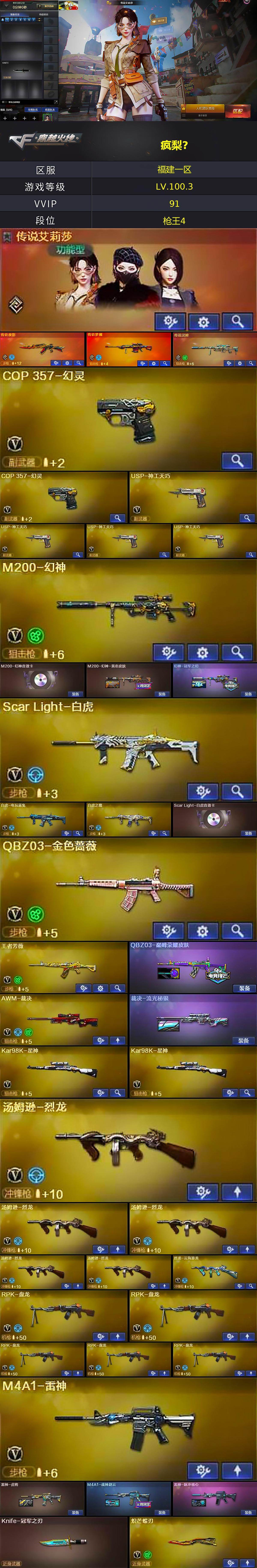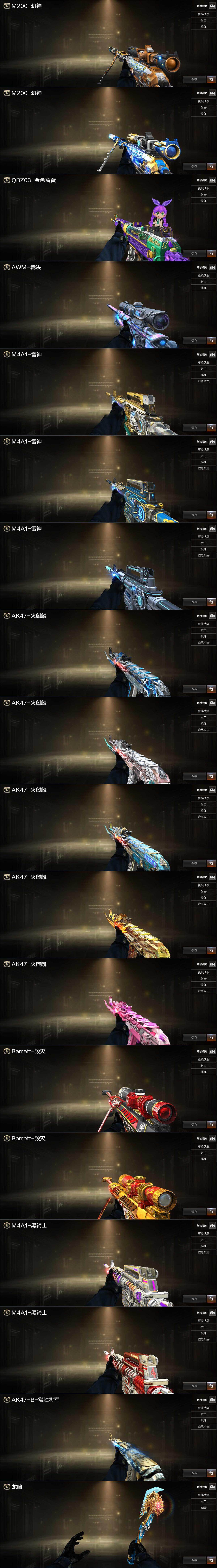 【热门武器】:传说梦魇,传说夜影,传说灵眸,QBZ03-金色蔷薇,M14EBR-玄武,Scar Light-白虎,M4A1-青龙,M200-幻神,死亡之眼,白虎-电玩蓝兔,Kar98K-星神*2,C.A.T,炼狱-迷你小钢,毒蜂,M4A1-黑骑士*2,汤姆逊-烈龙*5,RPK-盘龙*5,加特林-炼狱,COP 357-幻灵*2,沙鹰-修罗,柯尔特-赛博朋克*2,Knife-冠军之刃,炽芒蝶刃,金刚伞