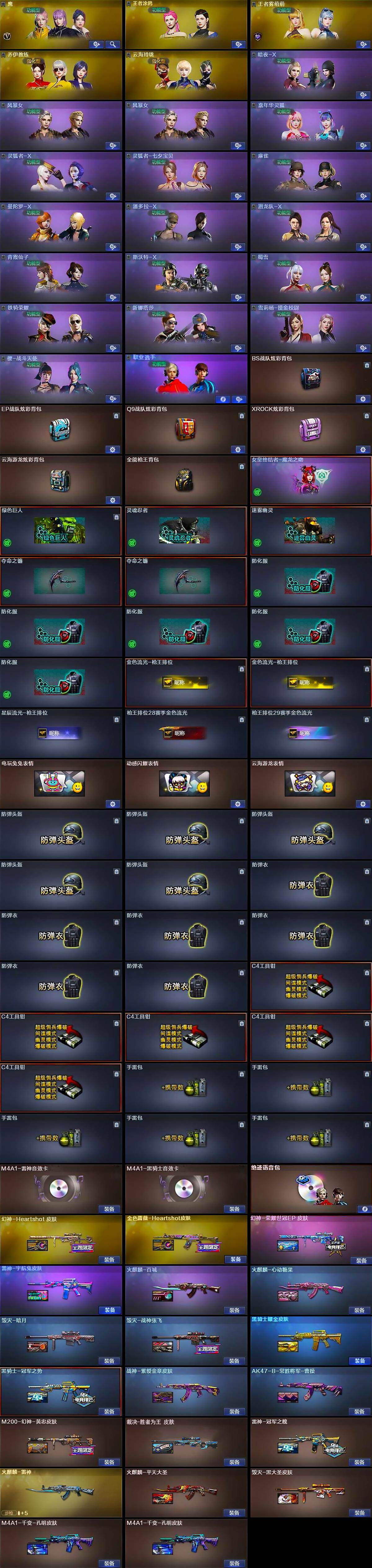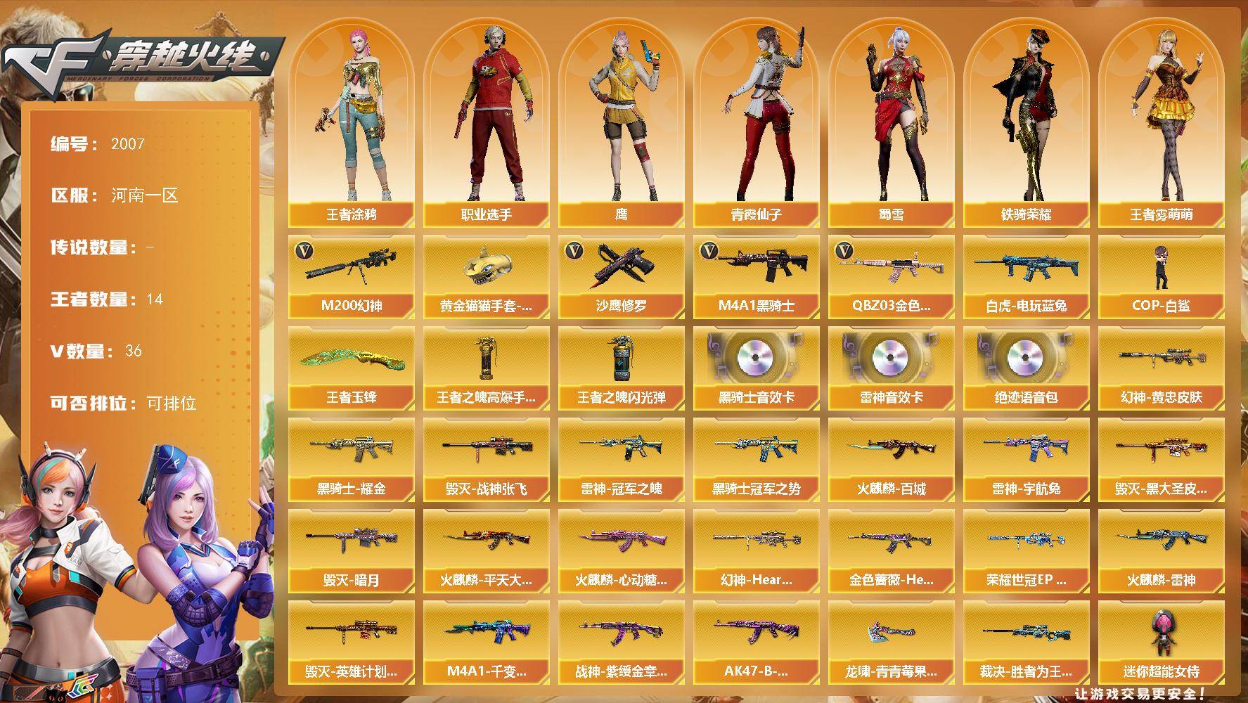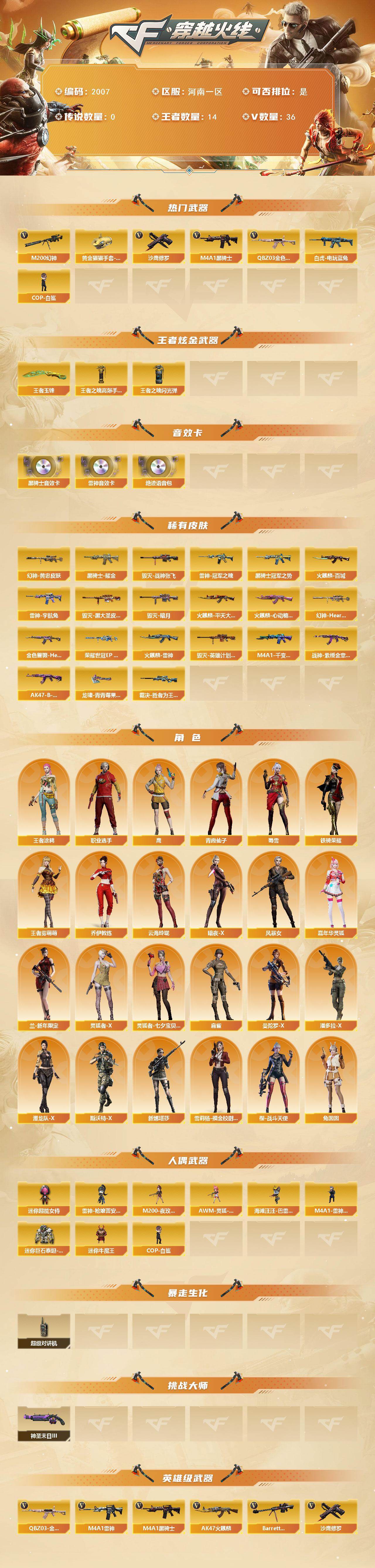 - [16175115]广东一区-49V-7王者-0炫金 【热门武器】:M200-幻神,死亡之眼*2,荣耀世冠-雷神,M4A1-黑骑士,汤姆逊-烈龙*3,沙鹰-修罗*4,荣耀世冠-龙啸 【王者炫金武器】:USP-雷暴王者 【音效卡】:绝迹语音包,白鲨语音包,Barrett-碧霄极光音效卡,炼狱-百战金芒-庆典舞曲音效卡,死神-雪域霜狐-怀旧音效卡 【皮肤】:幻神-AG-CFPLS17冠军,幻神-动感闪耀 皮肤,幻神-荣耀世冠EP 皮肤,幻神-电竞之星 皮肤,裁决-过载 皮肤,雷神-能量核心,雷神-荣耀之魄,M4A1-战神赵云,M4A1-再燃火线,火麒麟-雷神,火麒麟-心动糖果,毁灭-荣耀之怒,毁灭-战神张飞,毁灭-英雄计划 皮肤,黑龙-暗月,黑骑士-战神马超,AWM-天龙-传奇70KG,修罗-能量核心*2,修罗-冠军之魂,修罗-百战金芒 皮肤,屠龙-荣耀之锋,屠龙-荣耀世冠AG,屠龙-春桃 皮肤,屠龙-巅峰荣耀 皮肤,轻型军用手斧-再燃火线,龙啸-青青莓果 皮肤 【角色】:鹰,妮妮,王者春,雪域霜狐,乔伊教练,暗夜-X,初恋灵狐,风暴女,娟娟,灵狐者-黄金海岸,麻雀,潘多拉-甜心教官,斯沃特-X,新娜塔莎,雪莉杨-摸金校尉,影武者-X 【人偶武器】:迷你救赎猎手,AWM-灵狐-15周年嘉年华,生化手雷-机甲核心,迷你深渊冰龙-王绿豆 【暴走生化】:死亡之眼*2 【英雄级武器】:AK47-火麒麟*2,M4A1-黑龙,M4A1-雷神,M4A1-黑骑士,死神-雪域霜狐,AK-47-猩红传说*2,荣耀世冠-雷神,加利尔ACE-天袭,Barrett-毁灭,Barrett-极光,AWM-裁决,M200-幻神,王者之怒-觉醒版,炼狱-百战金芒,汤姆逊-烈龙*3,沙鹰-修罗*4,王者之魂-觉醒版,屠龙,龙啸,擎天,荣耀世冠-龙啸,麒麟刺-百战金芒,丛林匕首-玄豹,高爆手雷-神工天巧*2,高爆手雷-玄豹,闪光弹-雷暴,闪光弹-神工天巧,闪光弹-玄豹,烟雾弹-玄豹,烟雾弹-荣耀世冠EP,M4A1-苍鸣雷神,Barrett-碧霄极光 【道具】:BS战队炫彩背包,CFS限定背包,云山科技背包,亚洲杯纪念炫彩背包,女皇终结者-背包,百战金芒炫彩背包,超级背包,雪域霜狐炫彩背包,女皇终结者-魔龙之吻,救世主-黑桃战神,绿色巨人,灵魂忍者*2,变异宝贝,迷雾幽灵*2,夺命之镰,防化服*3,金色流光-枪王排位*2,星辰