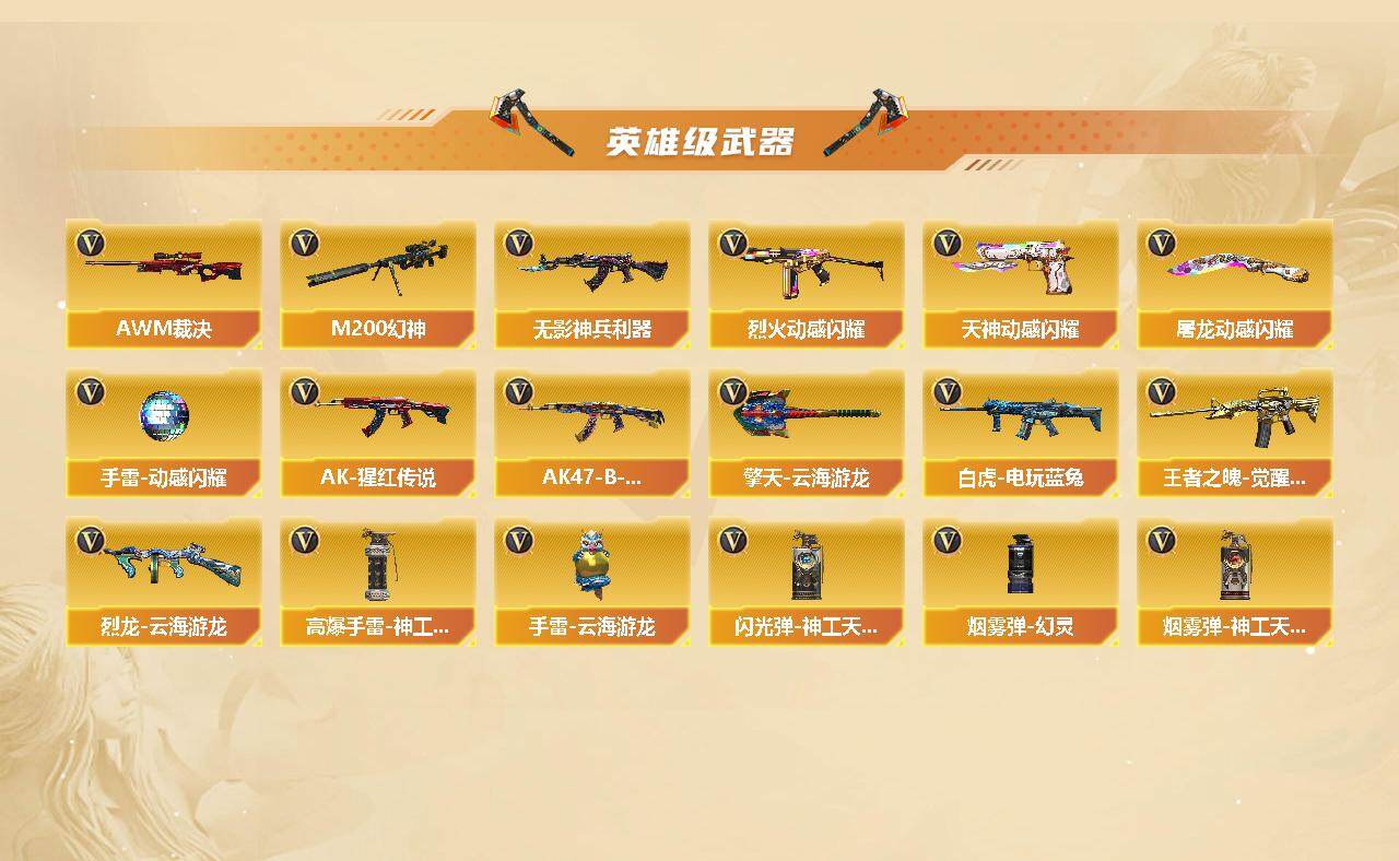 【英雄级武器】:AK47-火麒麟,M4A1-雷神,M4A1-黑骑士,无影-神兵利器,QBZ03-金色蔷薇,烈火-动感闪耀,王者之魄-觉醒版,AK-47-猩红传说,AK47-B-战神*3,白虎-电玩蓝兔,Barrett-毁灭,AWM-裁决,M200-幻神,烈龙-云海游龙,沙鹰-修罗,天神-动感闪耀,屠龙-动感闪耀,擎天-云海游龙,高爆手雷-神工天巧,手雷-动感闪耀,手雷-云海游龙,闪光弹-神工天巧,烟雾弹-幻灵,烟雾弹-神工天巧*3