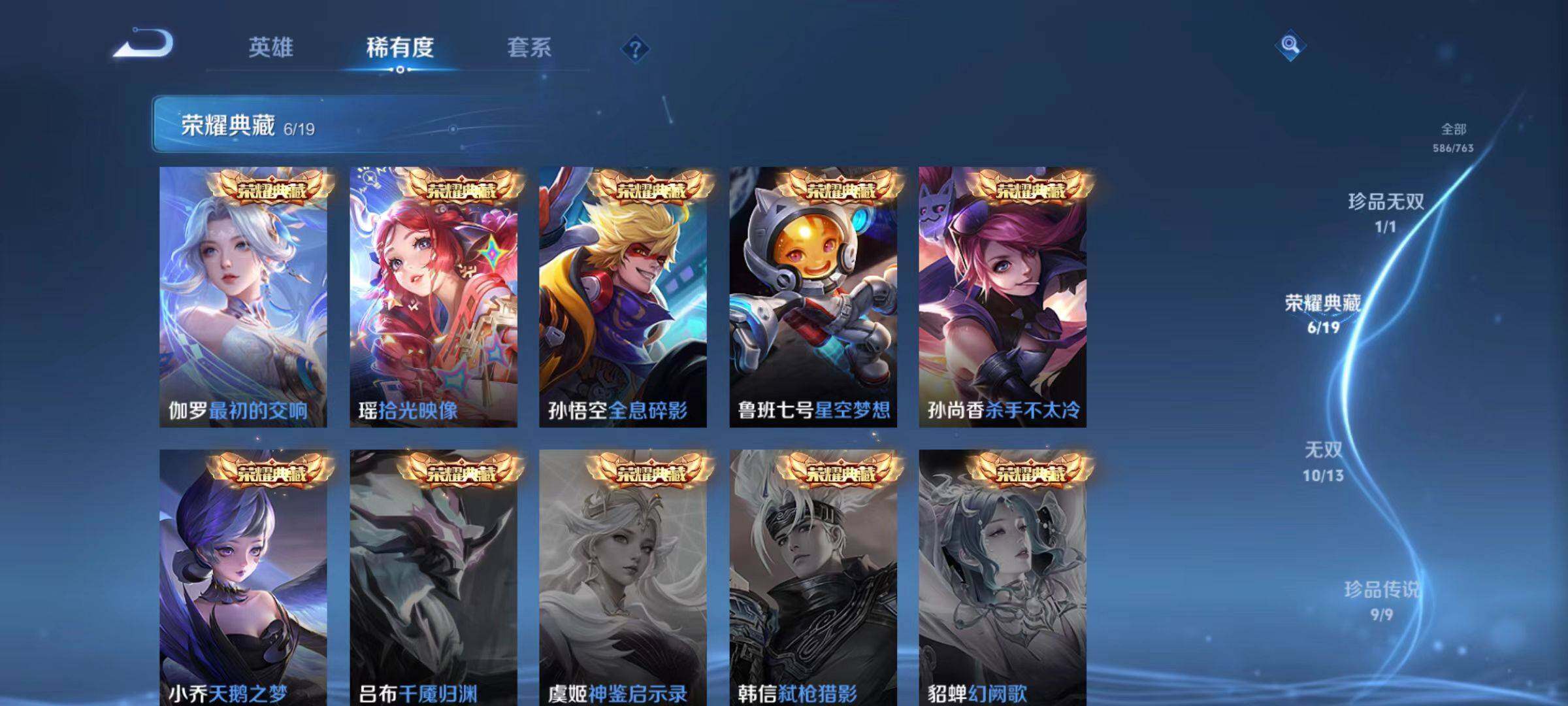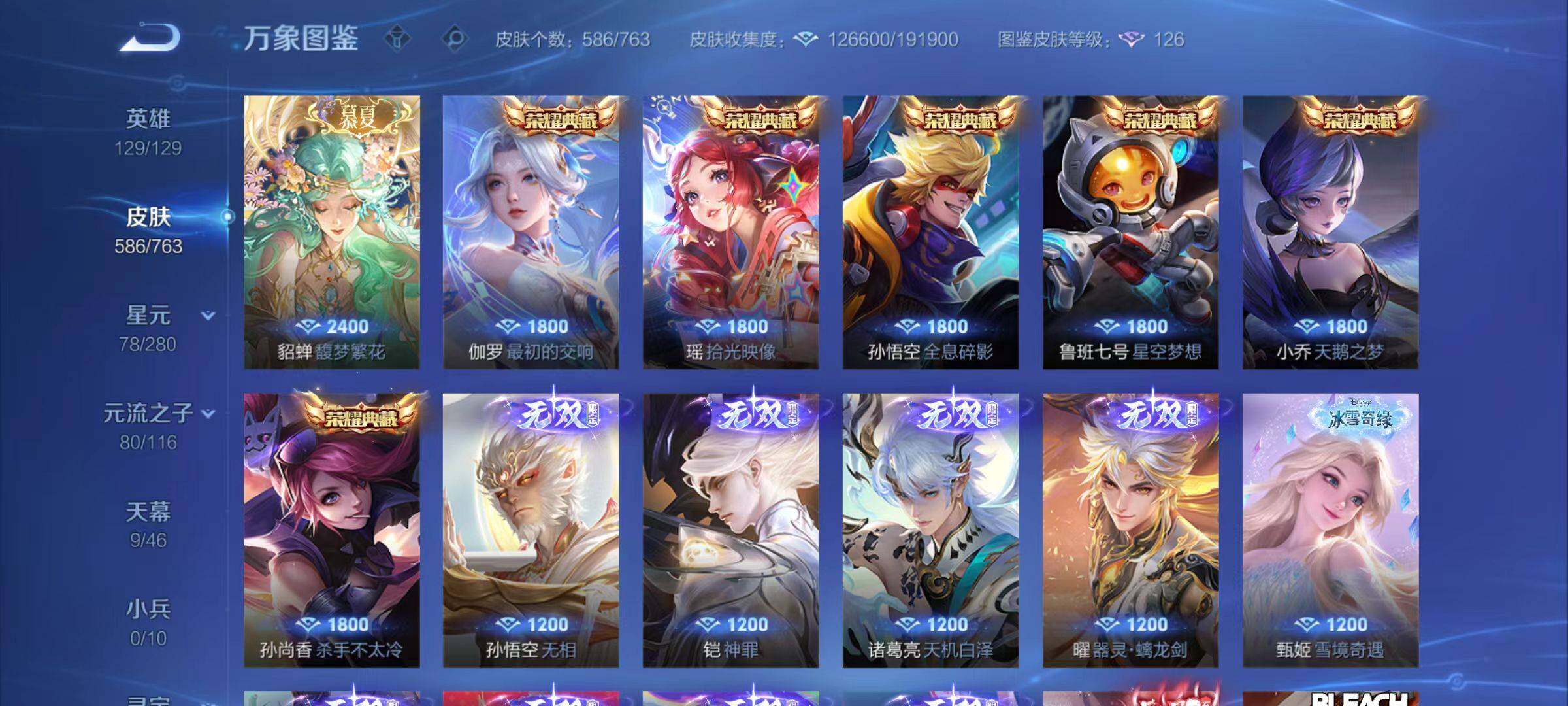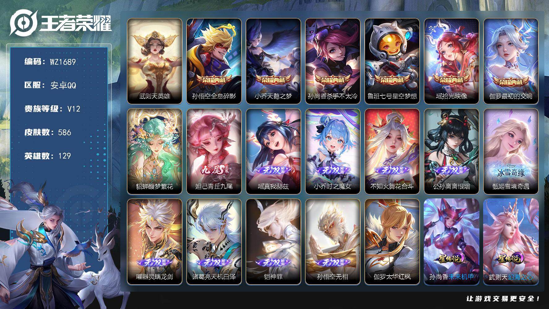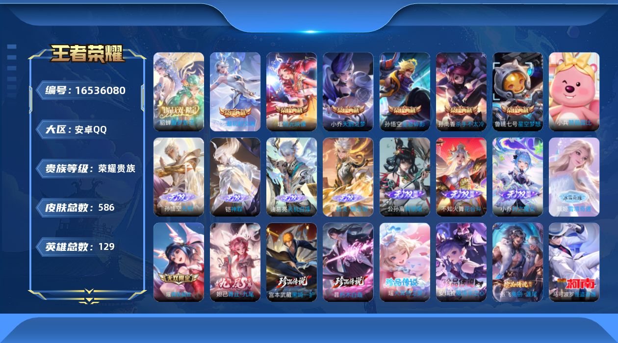 [16536080]安卓Q-V12-最强王者段位-129英雄-586皮肤-6典藏皮肤-1典藏英雄-1珍品无双-10无双-9珍品传说-83传说-193史诗