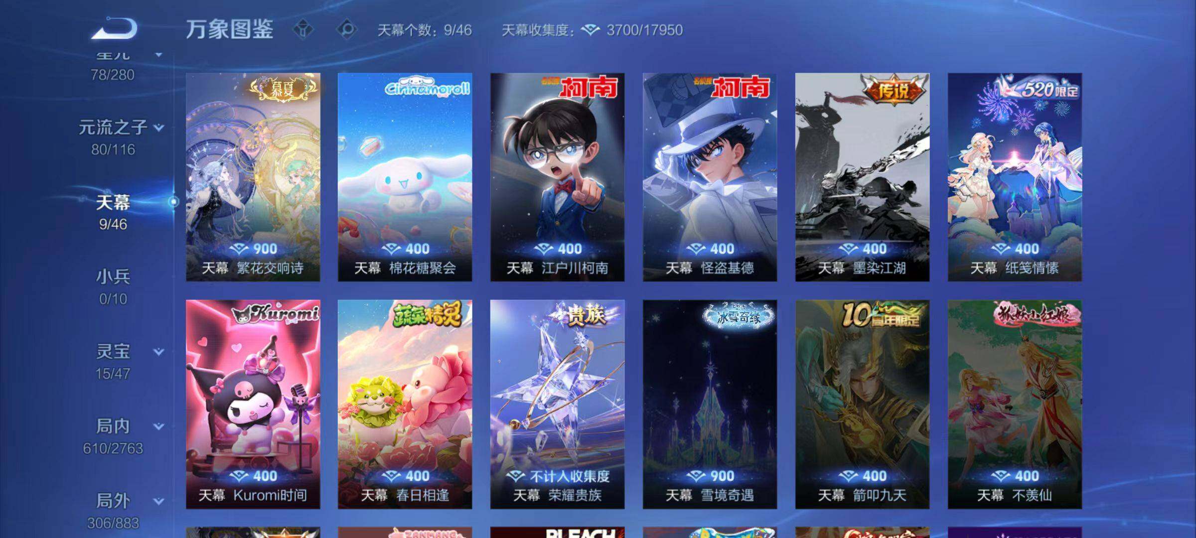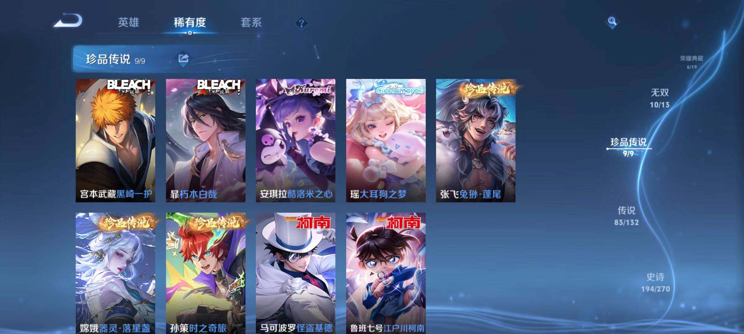 【珍品传说】:马可波罗怪盗基德,鲁班七号江户川柯南,孙策时之奇旅,嫦娥器灵落星盏,张飞兔狲蓬尾,瑶大耳狗之梦,安琪拉酷洛米之心,暃朽木白哉,宫本武藏黑崎一护