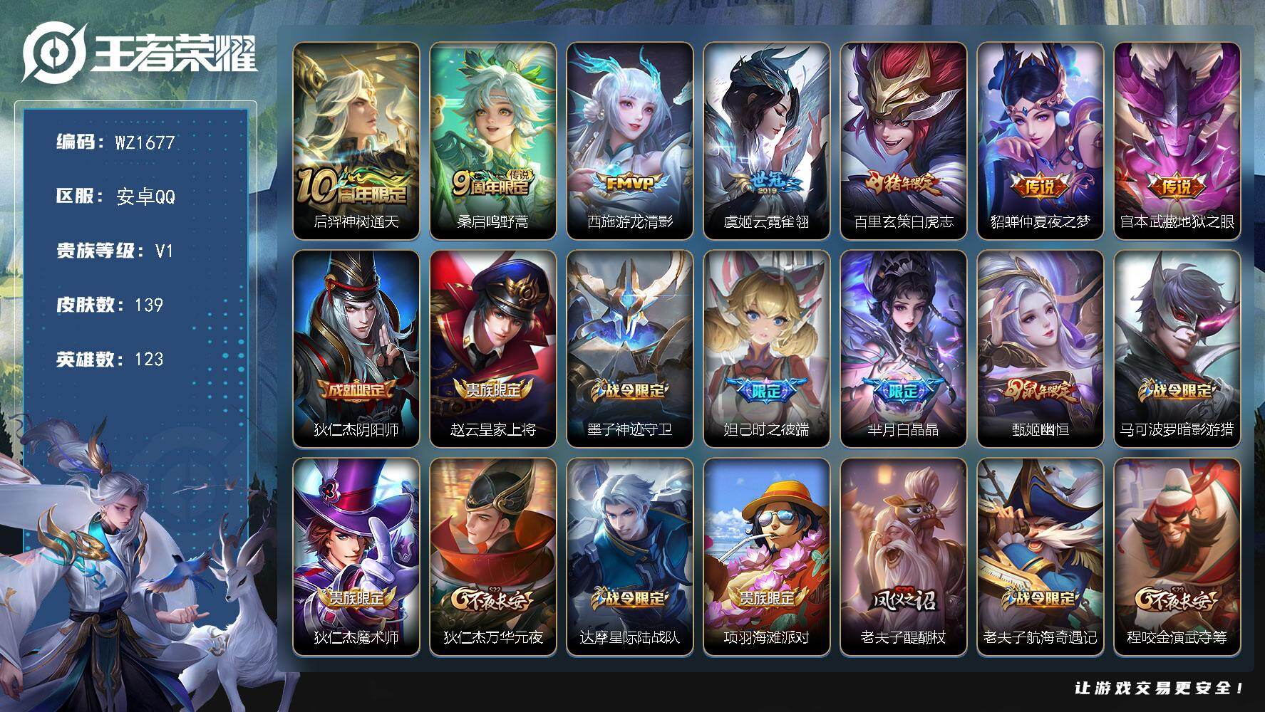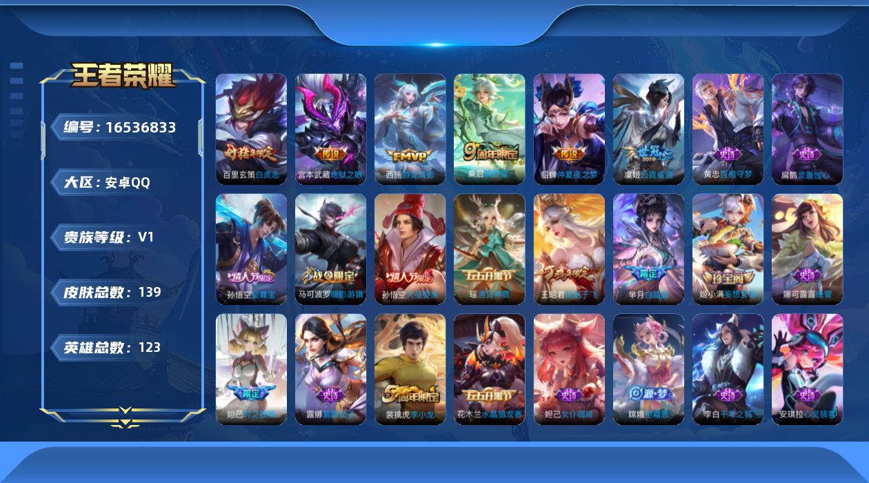 - [12145391]V7 4传说 123英雄 203皮肤 可修改实名 优质装备:久胜战神,一念神魔,地狱火 珍宝阁皮:蔷薇恋人,玩趣恶龙 限定皮:鸣野蒿,至尊宝,飞衡(韩信年限),五谷丰年,梁祝,李小龙,如梦令-后羿,猪悟能,大圣娶亲,冰霜恋舞曲 史诗皮:龙之律动,百相守梦-黄忠,紫霞仙子,黄金分割率,千年之狐,冰冠公主,末日机甲-吕布,节奏热浪,女仆咖啡,摇滚巨星,水果甜心,星夜王子,德古拉伯爵,幽灵船长,鬼剑武藏,舞动绿茵,地狱岩魂,乘风破浪,水晶猎龙者,曙光守护者,金属风暴,原初追逐者,圣诞恋歌,鹰眼统帅,王者之锤,黎明之约,赏金猎手,未来纪元-赵云