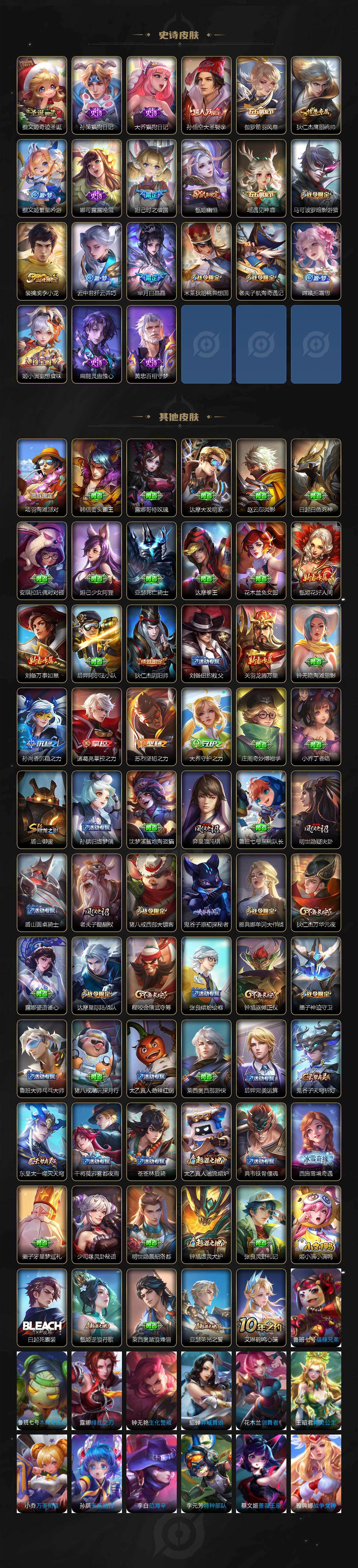 【史诗皮肤】:项羽苍穹之光,露娜紫霞仙子,赵云皇家上将,貂蝉圣诞恋歌,王昭君偶像歌手,狄仁杰魔术师,宫本武藏鬼剑武藏,孙尚香水果甜心,妲己魅力维加斯,妲己女仆咖啡,李白千年之狐,王昭君凤凰于飞,孙悟空至尊宝,花木兰水晶猎龙者,小乔缤纷独角兽,安琪拉心灵骇客,蔡文姬舞动绿茵,李元芳逐浪之夏,蔡文姬奇迹圣诞,孙策猫狗日记,大乔猫狗日记,孙悟空大圣娶亲,伽罗箭羽风息,狄仁杰鹰眼统帅,蔡文姬繁星吟游,娜可露露晚萤,妲己时之彼端,甄姬幽恒,瑶遇见神鹿,马可波罗暗影游猎,裴擒虎李小龙,云中君纤云弄巧,芈月白晶晶,米莱狄胡桃异想国,老夫子航海奇遇记,嫦娥拒霜思,姬小满妄想食味,扁鹊灵蛊蚀心,黄忠百相守梦