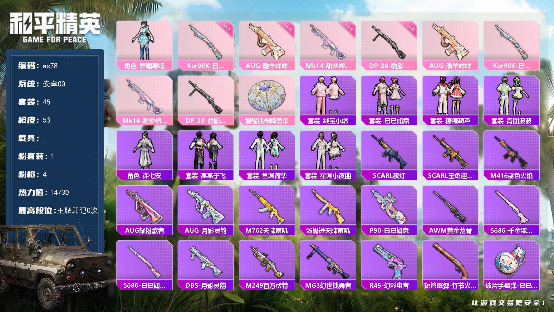 [16538081]安卓 手Q-1粉装-4特效枪-0载具-0粉色飞行器-14730热力值-1王牌印记-45套装-53枪皮 【粉色套装】:角色-异瞳寒姬 【粉色枪皮等级】:AUG-暖羊咩咩(五级),Kar98K-巳巳如意(五级),Mk14-甜梦熊击(五级),DP-28-豹影疾电(五级) 【粉色枪皮】:AUG-暖羊咩咩,Kar98K-巳巳如意,Mk14-甜梦熊击,DP-28-豹影疾电 【粉色降落伞】:智耀战神降落伞 【稀有套装】:套装-绒宝小鹅,套装-巳巳如意,套装-糖糖葫芦,套装-青团波波,角色-许七安,套装-燕燕于飞,套装-鱼渊荷华,套装-星渊小夜曲 【稀有枪皮】:SCAR-L-夜灯,SCAR-L-玉兔迎春,M416-蓝色火焰,AUG-耀粉歌者,AUG-月影灵韵,M762-天降萌叽,汤姆逊-天降萌叽,P90-巳巳如意,AWM-黄金龙骨,S686-巳巳如意,S686-千金淑猫,DBS-月影灵韵,M249-百万伏特,MG3-幻世战舞者,R45-幻彩电音,短管霰弹-竹节火铳,破片手榴弹-巳巳如意 【其他套装】:套装-人气偶像,套装-幻影武者,套装-旭日情侣,套装-暗金炫舞,套装-森林游猎者,套装-深蓝色名流,套装-猎鹰,套装-猛禽,套装-疯狂小兔子,套装-白色伏地魔,套装-破蛋小黄鸡,套装-红色运动,套装-蓝色运动,套装-街头潮人,套装-青年教官,套装-魅力单车,套装-黄色伏地魔,套装-黄色名流,套装-黄色运动,套装-黑色伏地魔,套装-快乐星愿,角色-白光莹,角色-粉雾星云 【稀有背包】:百万伏特背包(2级),金羽特工背包(1级) 【营地ID】:972823092