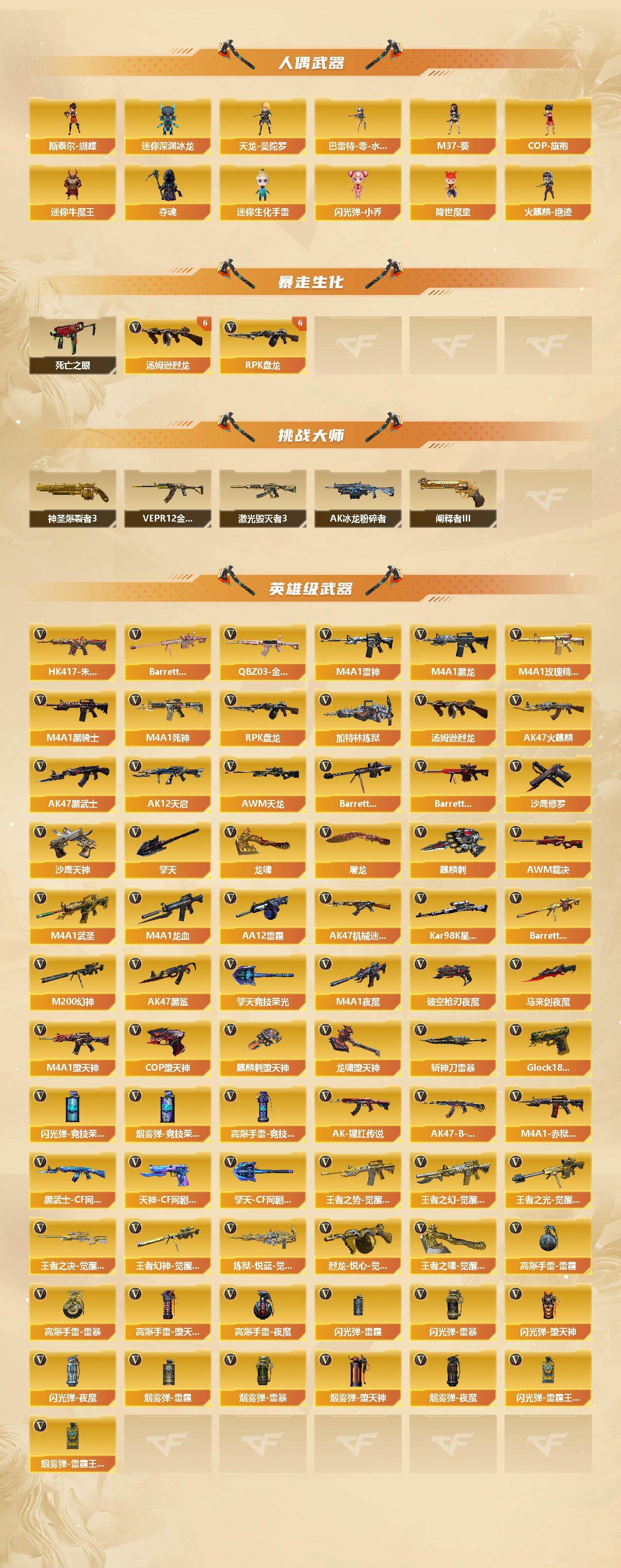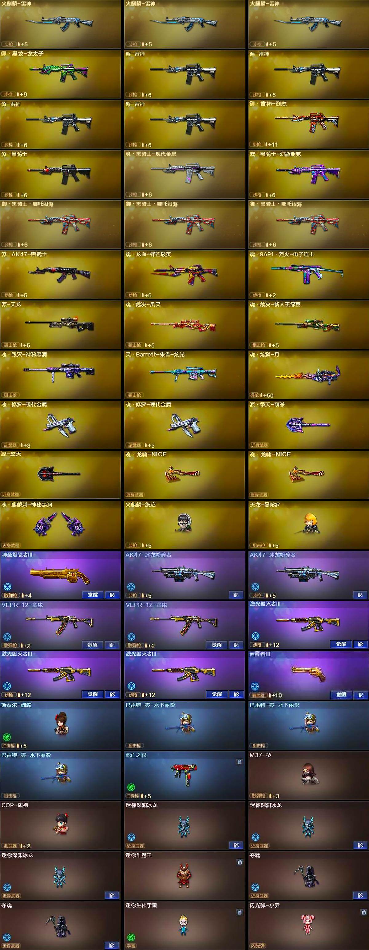【英雄级武器】:AK47-火麒麟*3,M4A1-黑龙*2,M4A1-雷神*2,M4A1-黑骑士*3,M4A1-死神,AK47-黑武士*5,AK12-天启*3,M4A