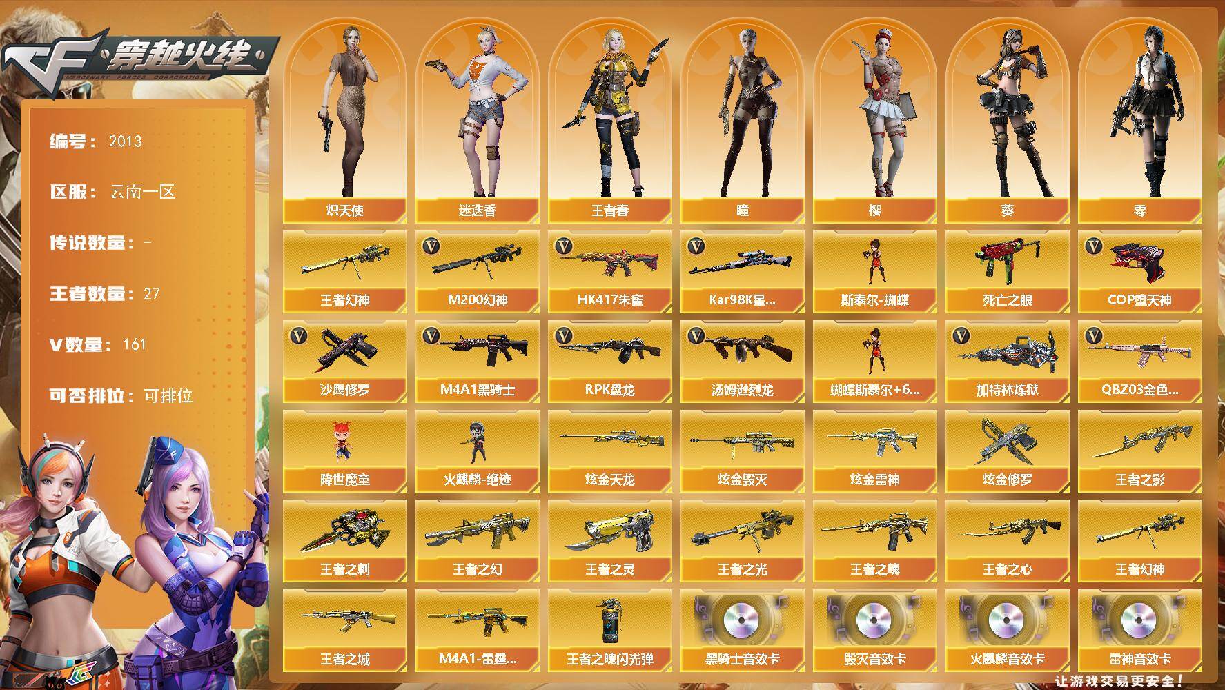 [16538816]云南一区-175V-27王者武器数-5炫金武器数 【热门武器】:王者幻神,QBZ03-金色蔷薇,HK417-朱雀,M200-幻神,死亡之眼,Kar98K-星神,M4A1-黑骑士*3,汤姆逊-烈龙*7,RPK-盘龙*7,加特林-炼狱*3,斯泰尔-蝴蝶,降世魔童,火麒麟-绝迹,COP-堕天神*2,沙鹰-修罗*2 【王者炫金武器】:王者之城*2,王者之幻,王者之影,王者之魄,王者之心,M4A1-雷霆王者,王者幻神,王者之光,王者之灵,王者之刺,炫金雷神*2,炫金毁灭,炫金天龙,炫金修罗,王者之魄闪光弹 【音效卡】:AK47-火麒麟音效卡,M4A1-雷神音效卡,M4A1-黑骑士音效卡*2,Barrett-毁灭音效卡,AWM-裁决音效卡 【皮肤】:幻神-电竞之星 皮肤,金色蔷薇-电竞之星 皮肤,星神-拼搏 皮肤,雷神-星空*2,雷神-虎将,雷神-传奇N9,雷神-维纳斯皮肤,火麒麟-雷神*3,火麒麟-华夏之心,火麒麟-轻羽皮肤,火麒麟-平天大圣,毁灭耀金皮肤*2,毁灭-星空,毁灭-黑大圣皮肤,毁灭-魔灵皮肤,毁灭-黑曼巴 皮肤,毁灭-虹光风暴 皮肤,毁灭-英雄计划 皮肤,M4A1-千变-孔明皮肤*2,黑龙-能量核心,黑龙-暗月,黑骑士-暗月,黑骑士耀金皮肤,战神-粉色甜心皮肤,战神-紫绶金章皮肤*4,战神-流金岁月皮肤,天龙-能量核心,AWM-天龙-传奇70KG,AWM-天龙-传奇白鲨*2,极光-能量核心 【角色】:零,葵,樱,瞳,迷迭香,凌霄,审判者,王者春,王者炫,乔伊教练,云海玲珑,炽天使,空,暗夜-X,初恋灵狐,兰-新年限定,零-水下丽影,灵狐者-黄金海岸,龙儿,潘多拉-甜心教官,潜龙队-X,青霞仙子,铁骑-乘风破浪,铁骑荣耀,新娜塔莎,雪莉杨,雪莉杨-摸金校尉,影武者-X,雅典娜 【人偶武器】:火麒麟-绝迹,天龙-曼陀罗,斯泰尔-蝴蝶,巴雷特-零-水下丽影*3,M37-葵,COP-旗袍,迷你深渊冰龙*3,迷你牛魔王,夺魂*2,迷你生化手雷,闪光弹-小乔,降世魔童 【暴走生化】:死亡之眼 【挑战大师】:神圣爆裂者III,AK47-冰龙粉碎者*2,VEPR-12-金魔*2,激光毁灭者III*3,阐释者III 【英雄级武器】:AK47-火麒麟*3,M4A1-黑龙*2,M4A1-雷神*2,M4A1-黑骑士*3,M4A1-死神,AK47-黑武士*5,AK12-天启*3,M4A