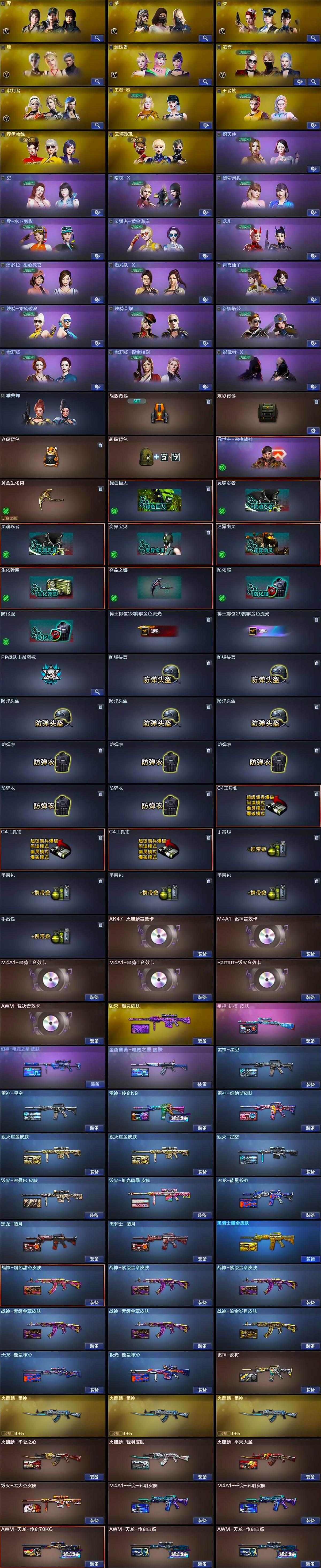 【皮肤】:幻神-电竞之星 皮肤,金色蔷薇-电竞之星 皮肤,星神-拼搏 皮肤,雷神-星空*2,雷神-虎将,雷神-传奇N9,雷神-维纳斯皮肤,火麒麟-雷神*3,火麒麟-华夏之心,火麒麟-轻羽皮肤,火麒麟-平天大圣,毁灭耀金皮肤*2,毁灭-星空,毁灭-黑大圣皮肤,毁灭-魔灵皮肤,毁灭-黑曼巴 皮肤,毁灭-虹光风暴 皮肤,毁灭-英雄计划 皮肤,M4A1-千变-孔明皮肤*2,黑龙-能量核心,黑龙-暗月,黑骑士-暗月,黑骑士耀金皮肤,战神-粉色甜心皮肤,战神-紫绶金章皮肤*4,战神-流金岁月皮肤,天龙-能量核心,AWM-天龙-传奇70KG,AWM-天龙-传奇白鲨*2,极光-能量核心