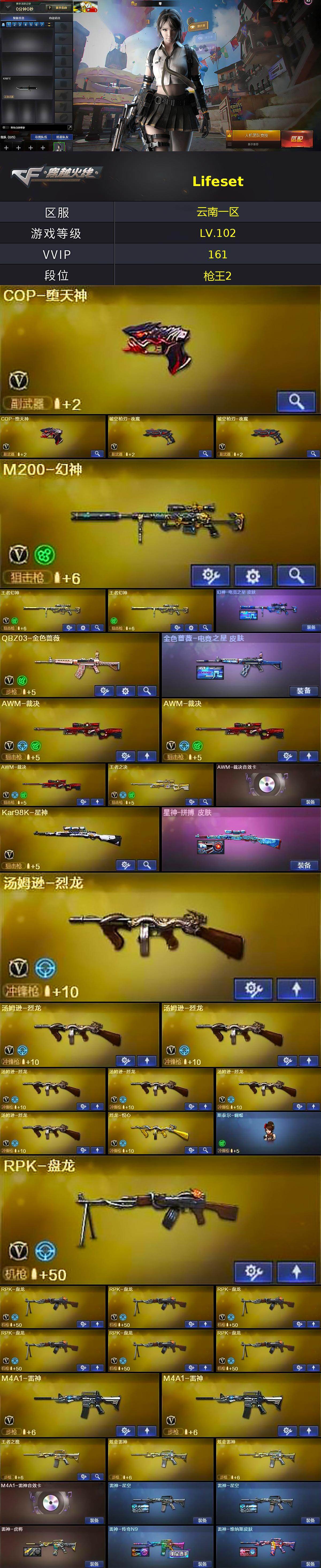 【热门武器】:王者幻神,QBZ03-金色蔷薇,HK417-朱雀,M200-幻神,死亡之眼,Kar98K-星神,M4A1-黑骑士*3,汤姆逊-烈龙*7,RPK-盘龙*7,加特林-炼狱*3,斯泰尔-蝴蝶,降世魔童,火麒麟-绝迹,COP-堕天神*2,沙鹰-修罗*2