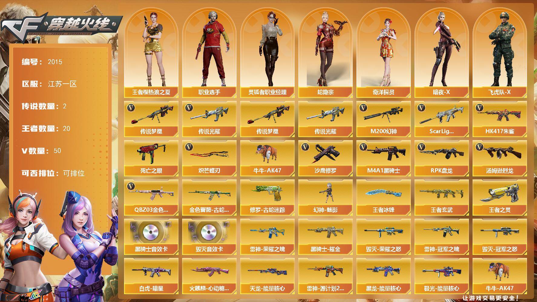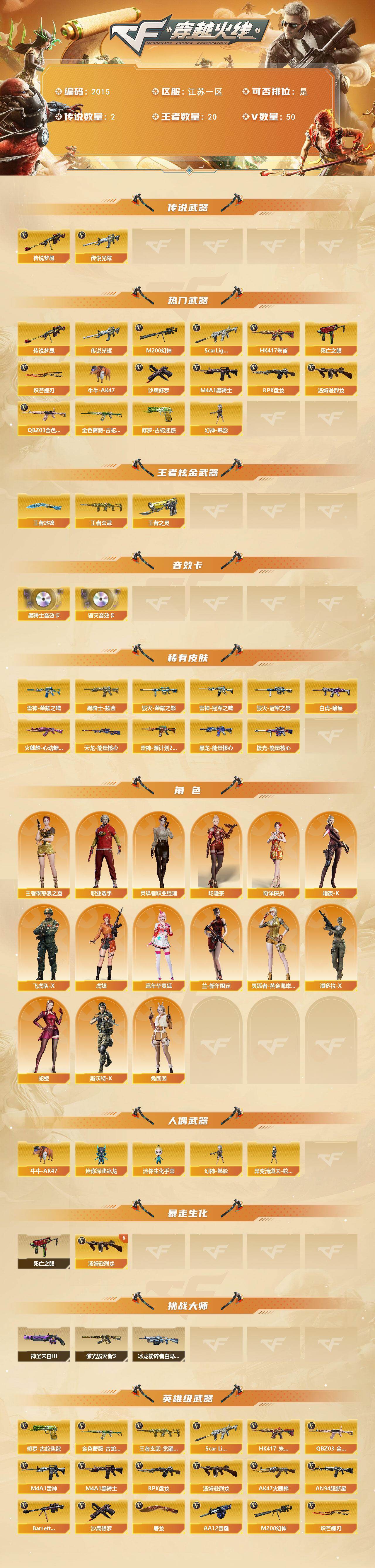 [16539531]江苏一区-49V-20王者武器数-0炫金武器数 【传说武器】:传说光耀,传说梦魇 【热门武器】:传说光耀,传说梦魇,QBZ03-金色蔷薇,Scar Light-白虎,HK417-朱雀,M200-幻神,金色蔷薇-古蛇迷踪,修罗-古蛇迷踪,死亡之眼,牛牛-AK47,M4A1-黑骑士,汤姆逊-烈龙*6,RPK-盘龙*3,幻神-魅影,沙鹰-修罗*2,炽芒蝶刃 【王者炫金武器】:王者玄武,王者之灵,王者冰锋 【音效卡】:M4A1-黑骑士音效卡,Barrett-毁灭音效卡 【皮肤】:Scar Light-白虎-暗星,雷神-荣耀之魄,雷神-冠军之魄,雷神-源计划2.0专属 皮肤,火麒麟-心动糖果,毁灭-荣耀之怒,毁灭-冠军之怒,黑龙-能量核心,黑骑士耀金皮肤,天龙-能量核心,极光-能量核心 【角色】:王者樱-热浪之夏,蛇隐宗,奇洋探员,暗夜-X,飞虎队-X,虎妞,嘉年华灵狐,兰-新年限定,灵狐者-黄金海岸,灵狐者-职业经理,潘多拉-X,蛇姬,斯沃特-X,兔囡囡,职业选手 【人偶武器】:幻神-魅影,异变清道夫-蛇影双骄,牛牛-AK47,迷你深渊冰龙,迷你生化手雷 【暴走生化】:死亡之眼 【挑战大师】:冰龙粉碎者-白马银枪,激光毁灭者III,神圣爆裂者-末日III 【英雄级武器】:AK47-火麒麟,M4A1-雷神,M4A1-黑骑士,AN94-超新星,HK417-朱雀,Scar Light-白虎,无影-神兵利器,黑武士-锦绣游龙,超新星-热带奇洋,金色蔷薇-古蛇迷踪,QBZ03-金色蔷薇,王者之武-觉醒版,王者之魄-觉醒版,王者冰魄-觉醒版,黑骑士-海王*2,王者玄武-觉醒版,Barrett-毁灭,M200-幻神,RPK-盘龙*3,盘龙-悦心-觉醒版,汤姆逊-烈龙*6,AA-12-雷霆,沙鹰-修罗*2,柯尔特-竞技荣光,Anaconda-玄豹,修罗-古蛇迷踪,屠龙*2,擎天-竞技荣光,炽芒蝶刃,龙啸-热带奇洋,丛林匕首-玄豹,高爆手雷-幻灵,高爆手雷-云龙,手雷-热带奇洋,高爆手雷-古蛇迷踪,高爆手雷-玄豹,闪光弹-竞技荣光*2,闪光弹-云龙,烟雾弹-竞技荣光,烟雾弹-云龙,烟雾弹-古蛇迷踪,烟雾弹-雷霆王者-觉醒版,M4A1-赤狱骑士 【道具】:云山科技背包,古蛇迷踪炫彩背包,奇洋探员-海龟背包,热带奇洋炫彩背包,虎牙炫彩背包,超级背包,女皇终结者-魔龙之吻,救世主-黑桃战神,黄金