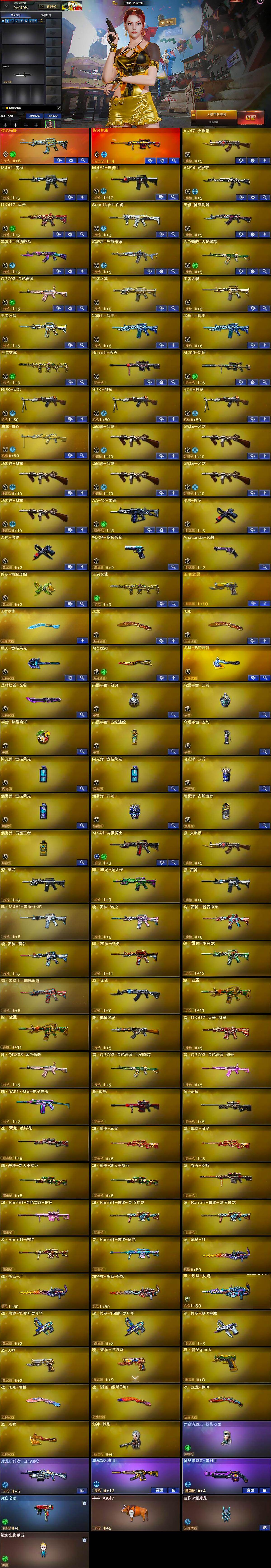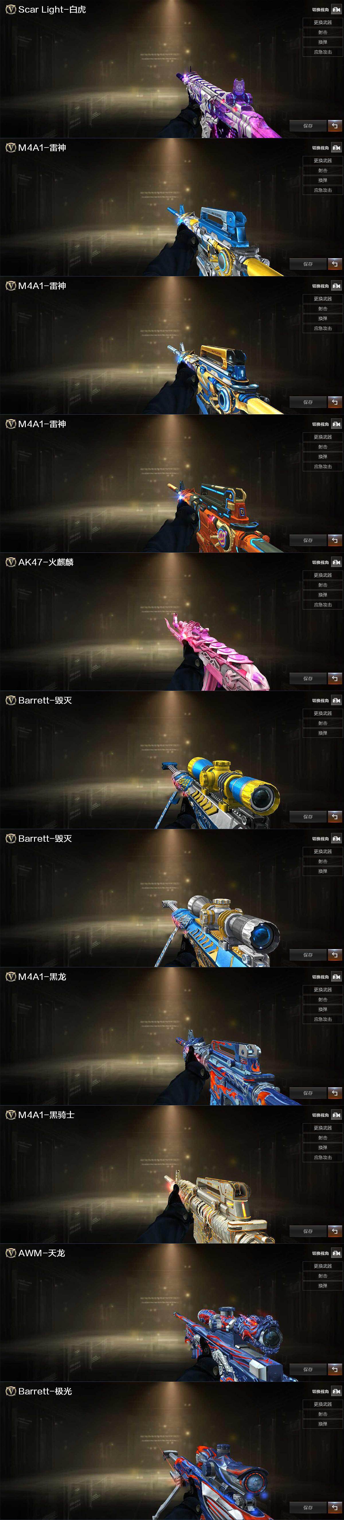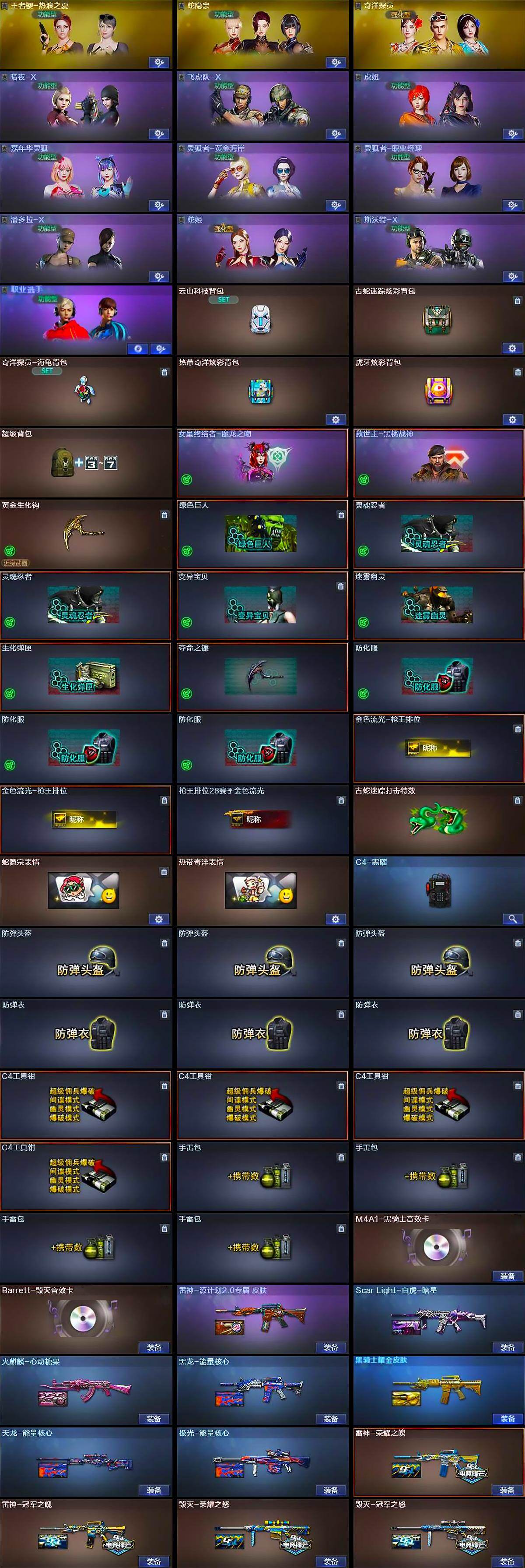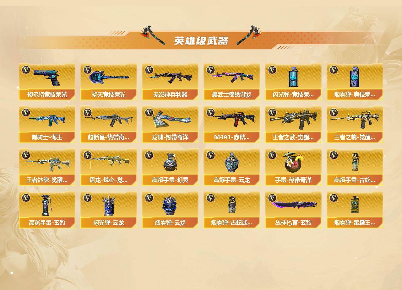 【英雄级武器】:AK47-火麒麟,M4A1-雷神,M4A1-黑骑士,AN94-超新星,HK417-朱雀,Scar Light-白虎,无影-神兵利器,黑武士-锦绣游龙,超新星-热带奇洋,金色蔷薇-古蛇迷踪,QBZ03-金色蔷薇,王者之武-觉醒版,王者之魄-觉醒版,王者冰魄-觉醒版,黑骑士-海王*2,王者玄武-觉醒版,Barrett-毁灭,M200-幻神,RPK-盘龙*3,盘龙-悦心-觉醒版,汤姆逊-烈龙*6,AA-12-雷霆,沙鹰-修罗*2,柯尔特-竞技荣光,Anaconda-玄豹,修罗-古蛇迷踪,屠龙*2,擎天-竞技荣光,炽芒蝶刃,龙啸-热带奇洋,丛林匕首-玄豹,高爆手雷-幻灵,高爆手雷-云龙,手雷-热带奇洋,高爆手雷-古蛇迷踪,高爆手雷-玄豹,闪光弹-竞技荣光*2,闪光弹-云龙,烟雾弹-竞技荣光,烟雾弹-云龙,烟雾弹-古蛇迷踪,烟雾弹-雷霆王者-觉醒版,M4A1-赤狱骑士