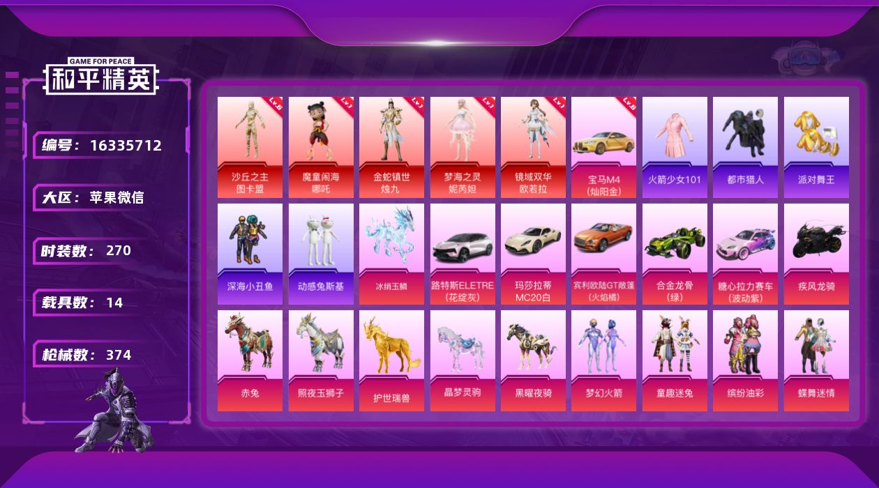 [16335712]5套6级红装可随意切换,老101,满级宝马!【特价出售/店主推荐】苹果 微信-无敌战神框-5神装-39粉装-30特效枪-14载具-26粉色飞行器-186936热力值-17王牌印记-270套装-374枪皮