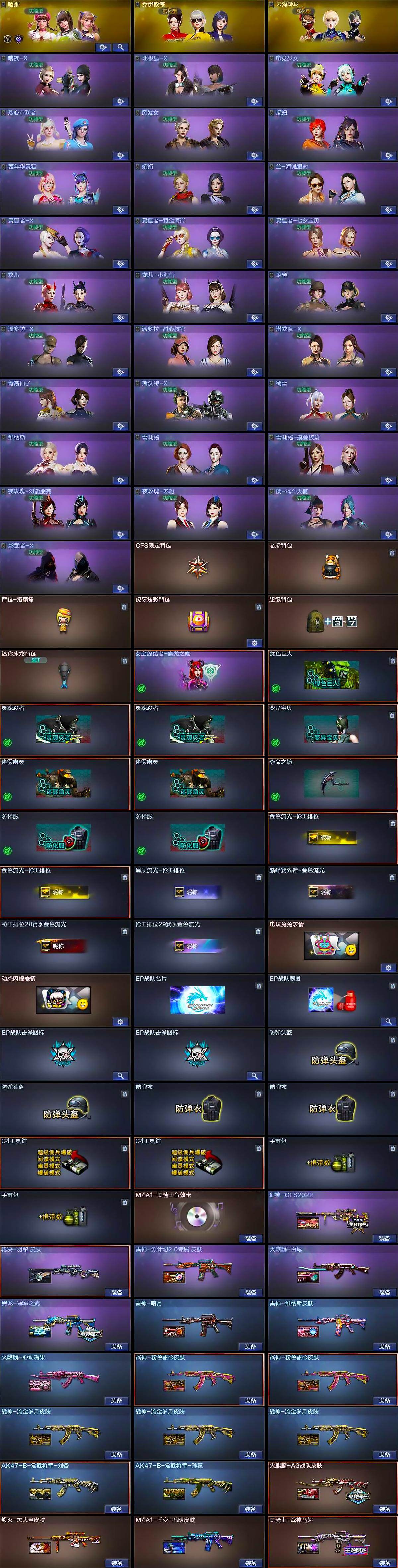 【角色】:晴雅,乔伊教练,云海玲珑,暗夜-X,北极狐-X,电竞少女,芳心审判者,风暴女,虎妞,嘉年华灵狐,娟娟,兰-海滩派对,兰-新年限定,0号玩家,灵狐者-X,灵狐者-黄金海岸,灵狐者-七夕宝贝,龙儿,龙儿-小淘气,麻雀,潘多拉-X,潘多拉-甜心教官,潜龙队-X,青霞仙子,斯沃特-X,蜀雪,兔囡囡,维纳斯,雪莉杨,雪莉杨-摸金校尉,夜玫瑰-幻能朋克,夜玫瑰-宠粉,樱-战斗天使,影武者-X