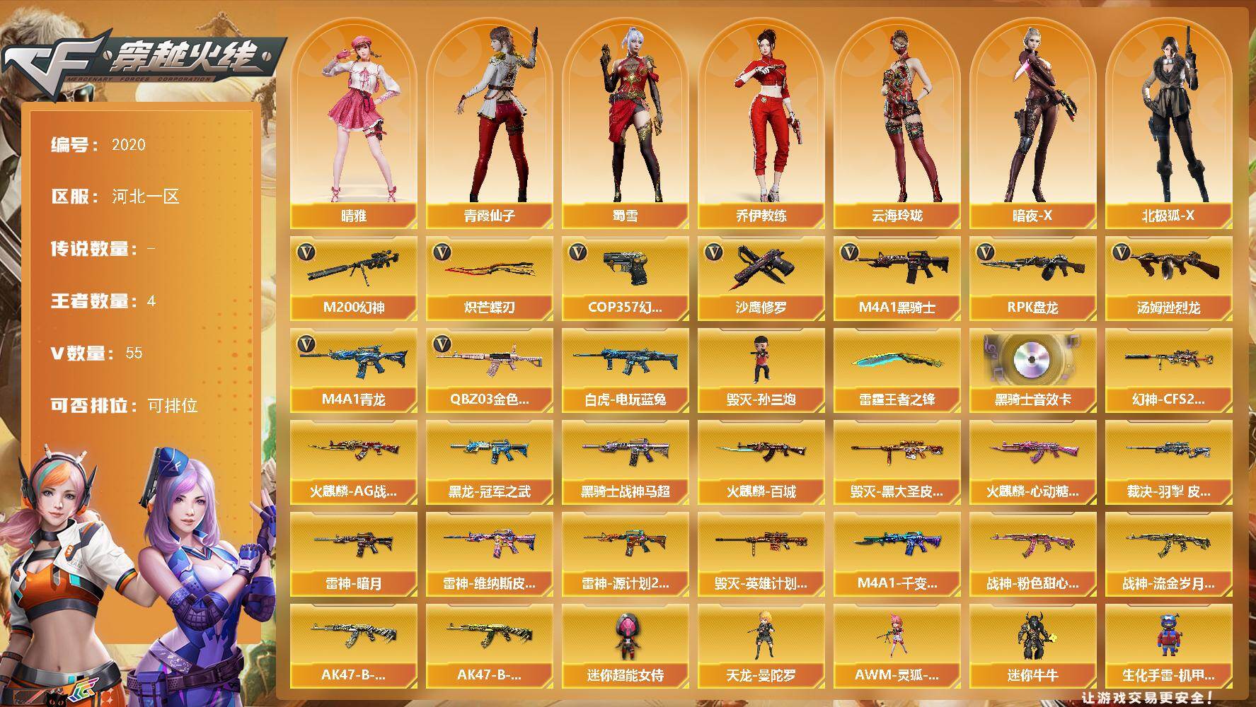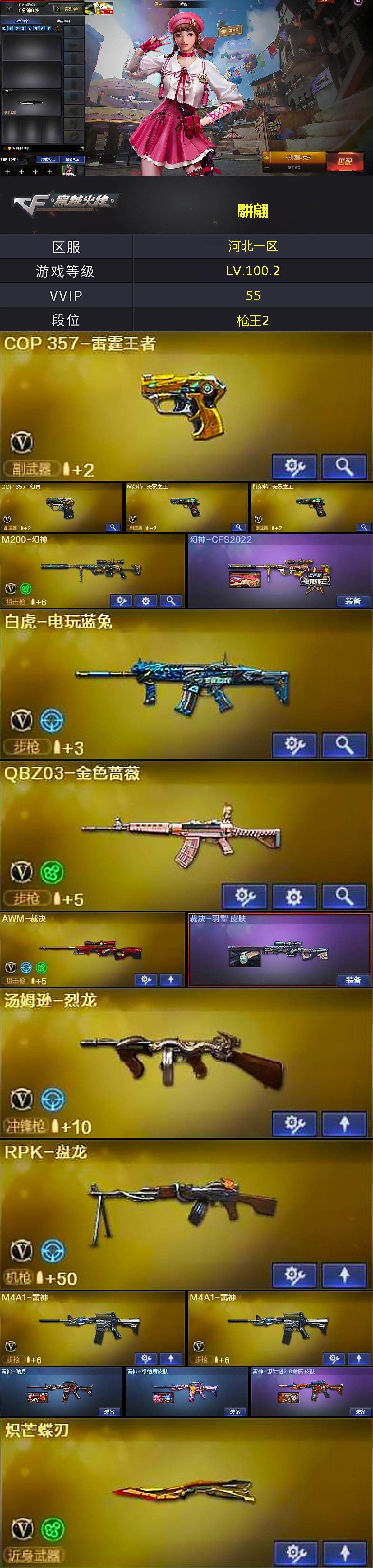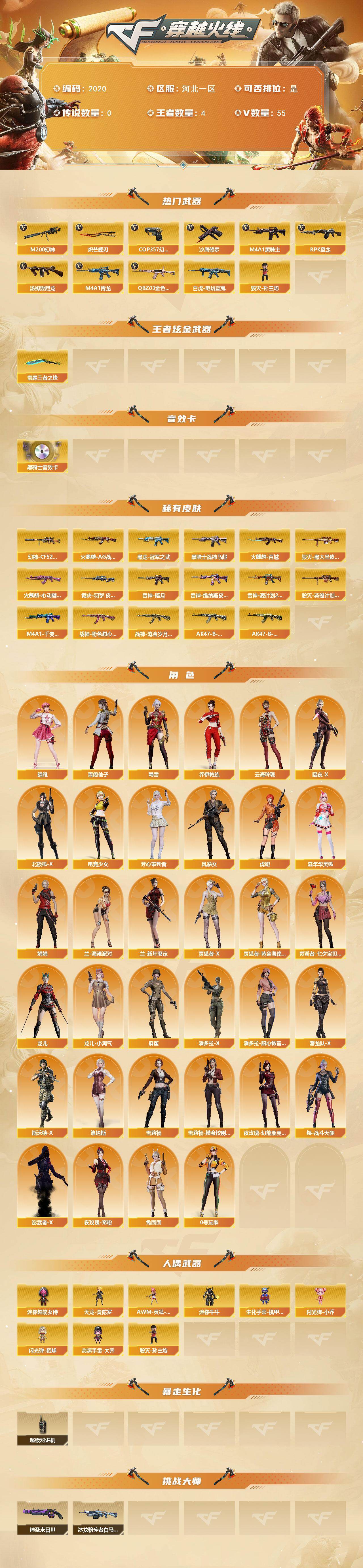 [16539620]河北一区-59V-4王者武器数-0炫金武器数 【热门武器】:QBZ03-金色蔷薇,M4A1-青龙,M200-幻神,白虎-电玩蓝兔,M4A1-黑骑士,汤姆逊-烈龙,RPK-盘龙,毁灭-孙三炮,COP 357-幻灵,沙鹰-修罗,炽芒蝶刃 【王者炫金武器】:雷霆王者之锋 【音效卡】:M4A1-黑骑士音效卡 【皮肤】:幻神-CFS2022,裁决-羽掣 皮肤,雷神-暗月,雷神-维纳斯皮肤,雷神-源计划2.0专属 皮肤,火麒麟-AG战队皮肤,火麒麟-百城,火麒麟-心动糖果,毁灭-黑大圣皮肤,毁灭-英雄计划 皮肤,M4A1-千变-孔明皮肤,黑龙-冠军之武,黑骑士-战神马超,战神-粉色甜心皮肤*2,战神-流金岁月皮肤*3,AK47-B-常胜将军-刘备,AK47-B-常胜将军-孙权 【角色】:晴雅,乔伊教练,云海玲珑,暗夜-X,北极狐-X,电竞少女,芳心审判者,风暴女,虎妞,嘉年华灵狐,娟娟,兰-海滩派对,兰-新年限定,0号玩家,灵狐者-X,灵狐者-黄金海岸,灵狐者-七夕宝贝,龙儿,龙儿-小淘气,麻雀,潘多拉-X,潘多拉-甜心教官,潜龙队-X,青霞仙子,斯沃特-X,蜀雪,兔囡囡,维纳斯,雪莉杨,雪莉杨-摸金校尉,夜玫瑰-幻能朋克,夜玫瑰-宠粉,樱-战斗天使,影武者-X 【人偶武器】:毁灭-孙三炮,天龙-曼陀罗,AWM-灵狐-15周年嘉年华,迷你牛牛,生化手雷-机甲核心*2,闪光弹-小乔,闪光弹-貂蝉,高爆手雷-大乔,迷你超能女侍 【暴走生化】:超级对讲机 【挑战大师】:冰龙粉碎者-白马银枪,神圣爆裂者-末日III 【英雄级武器】:AK47-火麒麟,M4A1-黑龙,M4A1-雷神*2,M4A1-黑骑士,AK12-天启,M4A1-青龙,无影-神兵利器,黑武士-锦绣游龙,QBZ03-金色蔷薇,AK-47-猩红传说,AK47-B-战神*2,AK47-B-常胜将军,白虎-电玩蓝兔,Barrett-毁灭,AWM-裁决,M200-幻神,RPK-盘龙,汤姆逊-烈龙,沙鹰-修罗,沙鹰-天神,COP 357-雷霆王者-觉醒版,COP 357-幻灵,柯尔特-无冕之王*2,天神-动感闪耀,屠龙,龙啸,擎天,麒麟刺,幻灵之锋,炽芒蝶刃,屠龙-动感闪耀,高爆手雷-雷暴,高爆手雷-幻灵*3,手雷-动感闪耀,手雷-云海游龙,闪光弹-雷暴,闪光弹-幻灵*5,闪光弹-雷霆王者-觉醒版,烟雾弹-幻灵*4,烟雾弹-竞技荣
