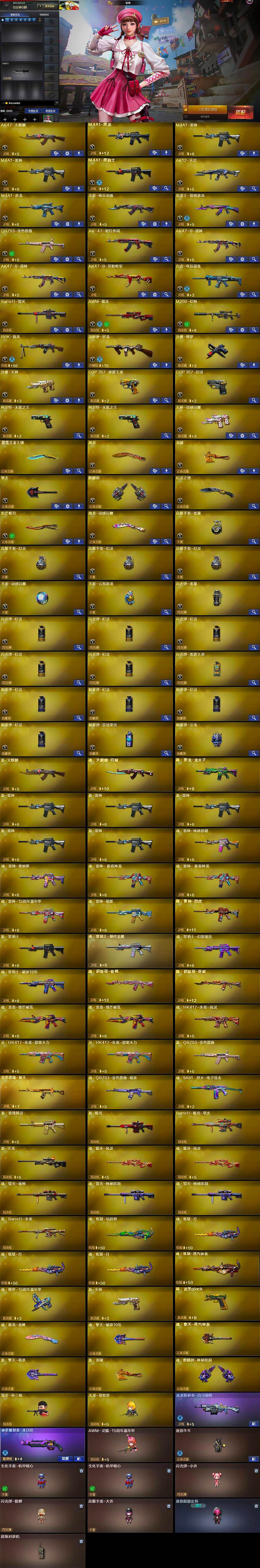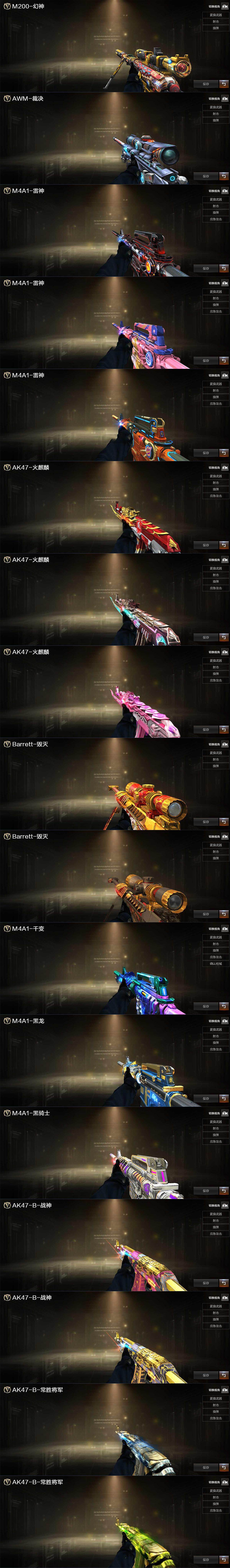 【英雄级武器】:AK47-火麒麟,M4A1-黑龙,M4A1-雷神*2,M4A1-黑骑士,AK12-天启,M4A1-青龙,无影-神兵利器,黑武士-锦绣游龙,QBZ03-金色蔷薇,AK-47-猩红传说,AK47-B-战神*2,AK47-B-常胜将军,白虎-电玩蓝兔,Barrett-毁灭,AWM-裁决,M200-幻神,RPK-盘龙,汤姆逊-烈龙,沙鹰-修罗,沙鹰-天神,COP 357-雷霆王者-觉醒版,COP 357-幻灵,柯尔特-无冕之王*2,天神-动感闪耀,屠龙,龙啸,擎天,麒麟刺,幻灵之锋,炽芒蝶刃,屠龙-动感闪耀,高爆手雷-雷暴,高爆手雷-幻灵*3,手雷-动感闪耀,手雷-云海游龙,闪光弹-雷暴,闪光弹-幻灵*5,闪光弹-雷霆王者-觉醒版,烟雾弹-幻灵*4,烟雾弹-竞技荣