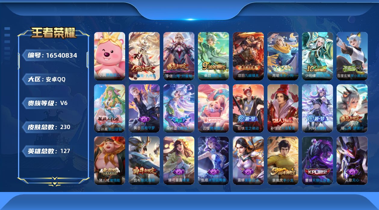 - [12088425]V8 1典藏 22传说 124英雄 248皮肤 可修改实名 优质装备:鸣剑·曳影,黄金狮子座,冠军飞将,云鹰飞将(小将军),猫影幻舞,久胜战神,炽阳神光,一念神魔,时之恋人-刘备(电焊工),超时空战士-狄仁杰,无双飞将,山海·炽霜斩(李信年限),浮生妄,鹤羽星尊,澜逐花归海 传说皮:乘龙·淬吴钩(孙策年限) 珍宝阁皮:万物之道,玩趣恶龙 限定皮:愿照·九州拓(澜年限),鸣野蒿,异界灵契(白毛香),遇见飞天,怒海麟威,五谷丰年,冰锋战神,游园惊梦,梁祝,逐梦之星,逐梦之影,永曜之星,深海之息(深海大菠萝),山海·玄木吟(马可年限) 史诗皮:器灵·浮梦炉,星界战将,龙之律动,幻珠鲛人,蔬乡物语(鲁班七号),百相守梦-黄忠,织梦人,紫霞仙子,特工魅影,千年之狐,江河有灵,魅语,百解令(蒙犽),高渐离燃音魔法,蒙恬荣光圣徽,偶像歌手,晚萤,电玩·爆裂旋风,末日机甲-吕布,猫狗日记-孙策,猫狗日记-大乔,时之恋人-孙尚香,乱世虎臣,节奏热浪,修罗,女仆咖啡,摇滚巨星,水果甜心,绅士熊喵,星夜王子,心灵骇客,功夫厨神,暗隐猎兽者,幽灵船长,鬼剑武藏,暗渊魔法,心灵战警,舞动绿茵,地狱岩魂,纤云弄巧,繁星吟游(呼啦呼啦),缤纷独角兽,乘风破浪,逐浪之夏,月团寄思,水晶猎龙者,热力回旋,金属风暴,原初追逐者,圣诞恋歌,鹰眼统帅,黎明之约,赏金猎手,无心,未来纪元-赵云