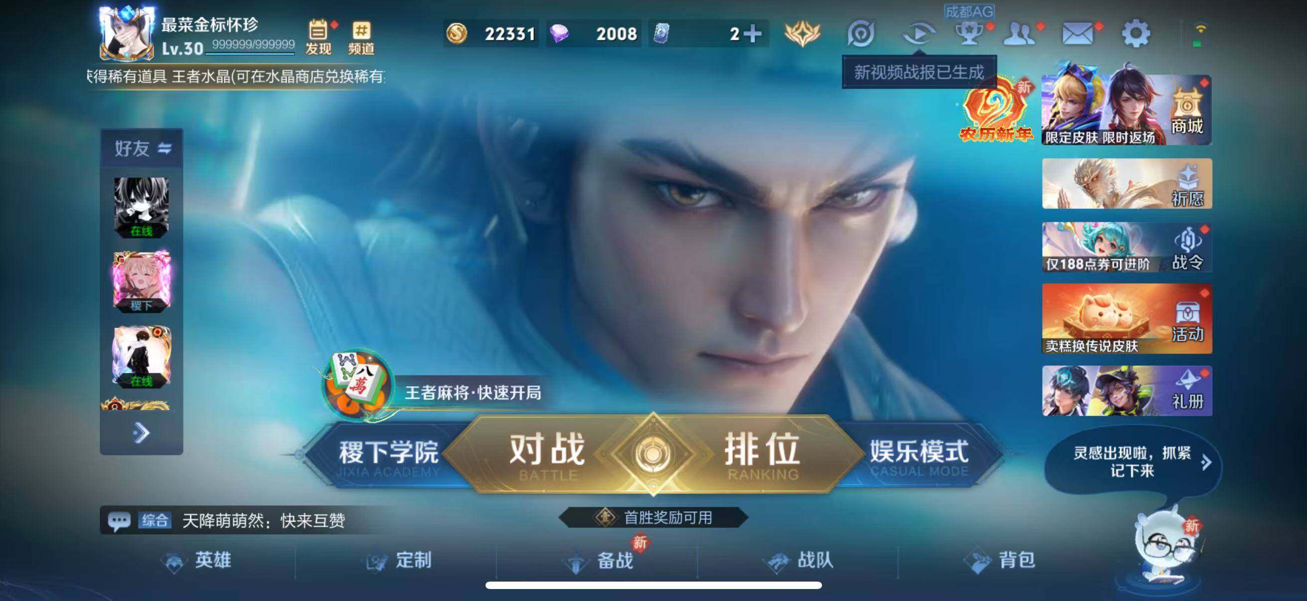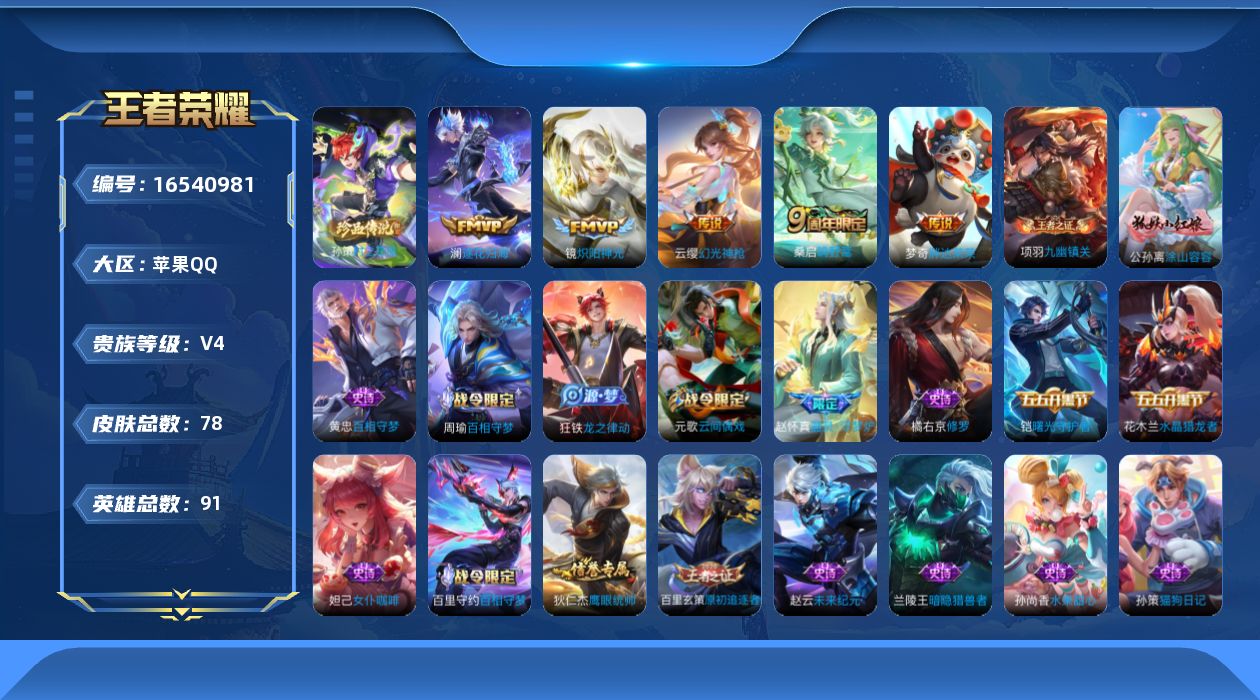 - [13009598]安卓Q-V1-最强王者段位-126英雄-261皮肤-1典藏-0珍品无双-0无双-0珍品传说-11传说-79史诗 【英雄全皮】:蒙恬全皮,影全皮 【荣耀典藏】:花木兰九霄神辉 【传说皮肤】:后羿神树通天,桑启鸣野蒿,小乔山海琳琅生,曜山海苍雷引,李信山海炽霜斩,不知火舞绯月行,曜云鹰飞将,虞姬云霓雀翎,后羿黄金射手座,孙尚香末日机甲,狄仁杰超时空战士 【限定皮肤】:蔡文姬夏日便利店,大乔绒语心约,虞姬夏日便利店,姜子牙天穹之誓,狄仁杰阴阳师,小乔山海琳琅生,赵云皇家上将,赵云引擎之心,嬴政优雅恋人,嬴政白昼王子,鲁班七号狮舞东方,庄周高山流水,钟无艳超时空战士,芈月重明,吕布猎兽之王,周瑜赤莲之焰,元歌云间偶戏,元歌无心,夏侯惇朔风刀,甄姬游园惊梦,甄姬落雪兰心,曹操烛龙,典韦穷奇,典韦蓝屏警告,马可波罗逐梦之星,马可波罗暗影游猎,马可波罗山海玄木吟,狄仁杰魔术师,狄仁杰万华元夜,达摩星际陆战队,项羽海滩派对,老夫子醍醐杖,关羽冰锋战神,程咬金演武夺筹,露娜一生所爱,兰陵王驯魔猎人,不知火舞绯月行,亚瑟潮玩骑士王,孙悟空大圣娶亲,牛魔御旌,后羿辉光之辰,李元芳云中旅人,钟馗神迹守卫,钟馗驱傩正仪,杨玉环遇见飞天,女娲朔望之晖,雅典娜黎明之约,鬼谷子原初探秘者,鬼谷子五谷丰年,大乔白鹤梁神女,苏烈千军破阵,百里玄策原初追逐者,弈星混沌棋,梦奇顽趣,沈梦溪大漠名商,明世隐疑决卦,裴擒虎李小龙,裴擒虎擒涛扼浪,狂铁御狮,米莱狄御霄,米莱狄胡桃异想国,云中君纤云弄巧,李信山海炽霜斩,伽罗天狼溯光者,盾山御銮,猪八戒西部大镖客,上官婉儿梁祝,嫦娥暖冬兔眠,曜山海苍雷引,西施玲珑珍味,鲁班大师探海日志,桑启海盐诗旅,暃星界游侠,戈娅驭风魔法,艾琳女武神,阿古朵江河有灵,张良古海寻踪,蒙犽百解令,蒙恬荣光圣徽,鬼谷子天穹祈灯,姬小满妄想食味,刘邦剑破天穹,周瑜熔金海岸 【年限皮肤】:后羿辉光之辰,马可波罗山海玄木吟,李信山海炽霜斩,小乔山海琳琅生,曜山海苍雷引 【赛季限定】:芈月重明,夏侯惇朔风刀,曹操烛龙,典韦穷奇,狄仁杰万华元夜,老夫子醍醐杖,程咬金演武夺筹,张良古海寻踪,牛魔御旌,李元芳云中旅人,钟馗驱傩正仪,雅典娜黎明之约,鬼谷子原初探秘者,苏烈千军破阵,百里玄策原初追逐者,弈星混沌棋,梦奇顽趣,沈梦溪大漠名商,明世隐疑决卦,裴擒虎擒涛扼浪,狂铁御狮,米莱狄御霄,盾山御銮