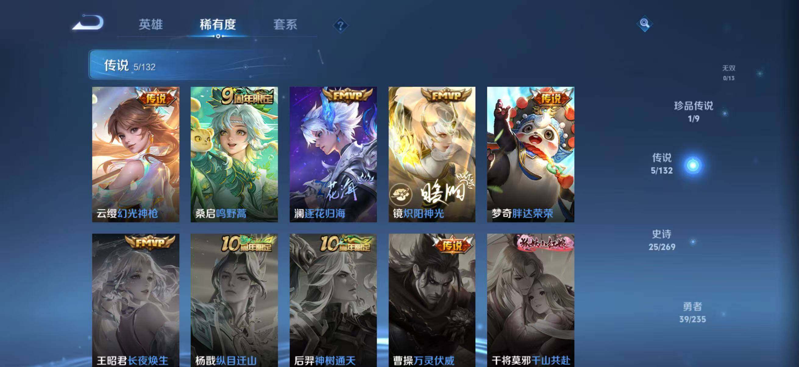 【传说皮肤】:云缨幻光神枪,桑启鸣野蒿,澜逐花归海,镜炽阳神光,梦奇胖达荣荣