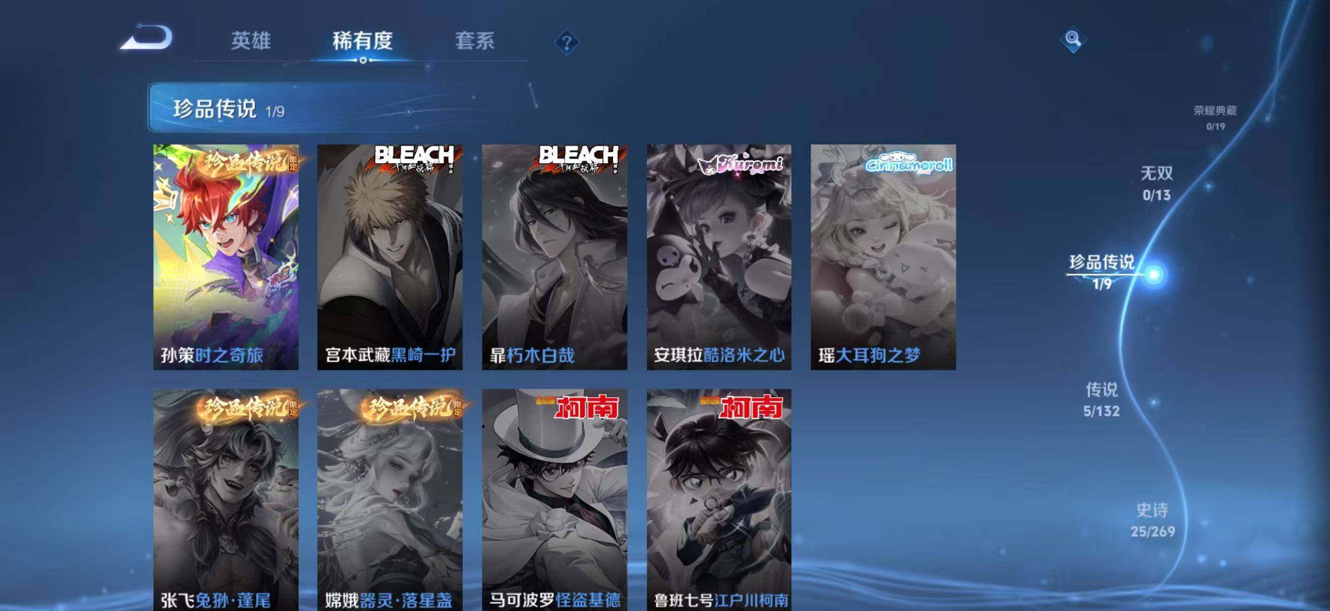 孙策猫狗日记,雅典娜冰冠公主,橘右京修罗,嬴政摇滚巨星,刘禅绅士熊喵,兰陵王暗隐猎兽者,宫本武藏鬼剑武藏,花木兰水晶猎龙者,铠曙光守护者,百里玄策原初追逐者,赵怀真器灵·浮梦炉