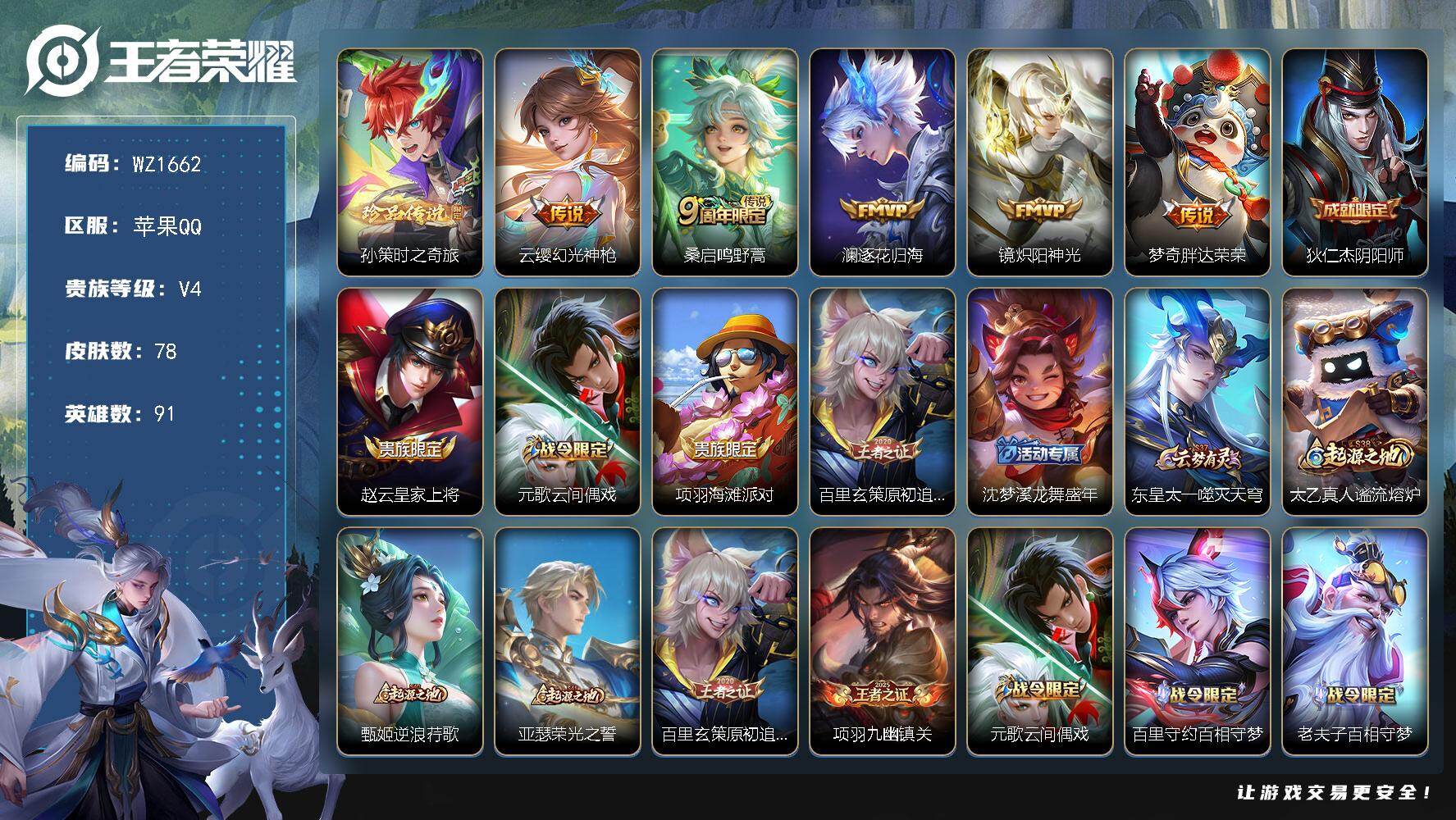 - [12746043]苹果Q-V9-永恒钻石IV段位-127英雄-320皮肤-3典藏-0珍品无双-0无双-0珍品传说-13传说-97史诗 【荣耀典藏】:武则天英雄,夏侯惇无限飓风号,孙尚香杀手不太冷,铠银白咏叹调 【传说皮肤】:李信山海炽霜斩,小乔音你心动,公孙离祈雪灵祝,虞姬启明星使,伽罗太华,干将莫邪久胜战神,虞姬云霓雀翎,花木兰冠军飞将,貂蝉仲夏夜之梦,孙尚香末日机甲,宫本武藏地狱之眼,孙悟空地狱火,武则天海洋之心 【限定皮肤】:姜子牙天穹之誓,狄仁杰阴阳师,赵云皇家上将,墨子神迹守卫,妲己时之彼端,嬴政优雅恋人,孙尚香蔷薇恋人,鲁班七号狮舞东方,庄周高山流水,高渐离死亡摇滚,阿轲迷踪丽影,钟无艳超时空战士,白起夜都怪侠,芈月重明,芈月白晶晶,芈月幻夜卜梦,吕布猎兽之王,周瑜赤莲之焰,元歌云间偶戏,夏侯惇朔风刀,甄姬游园惊梦,甄姬落雪兰心,曹操烛龙,典韦穷奇,典韦蓝屏警告,马可波罗暗影游猎,狄仁杰魔术师,狄仁杰万华元夜,达摩星际陆战队,达摩沙漠行僧,项羽海滩派对,老夫子醍醐杖,老夫子航海奇遇记,安琪拉魔法小厨娘,程咬金演武夺筹,刘邦夺宝奇兵,王昭君凤凰于飞,王昭君午后时光,兰陵王驯魔猎人,兰陵王金庭之子,花木兰青春决赛季,亚瑟潮玩骑士王,孙悟空至尊宝,牛魔御旌,后羿圣弓游侠,李元芳银河之约,李元芳云中旅人,虞姬启明星使,钟馗神迹守卫,钟馗驱傩正仪,杨玉环遇见飞天,杨戬潮玩骑兵,女娲朔望之晖,干将莫邪真爱魔法,雅典娜单词大作战,雅典娜黎明之约,蔡文姬繁星吟游,太乙真人饕餮,鬼谷子原初探秘者,鬼谷子五谷丰年,黄忠火炮绅士,苏烈千军破阵,百里玄策原初追逐者,弈星混沌棋,公孙离蜜橘之夏,公孙离祈雪灵祝,沈梦溪星空之诺,沈梦溪大漠名商,明世隐疑决卦,明世隐吟游魔法,裴擒虎李小龙,裴擒虎擒涛扼浪,狂铁御狮,狂铁电玩高手,米莱狄御霄,米莱狄胡桃异想国,云中君纤云弄巧,李信山海炽霜斩,伽罗太华,伽罗天狼溯光者,盾山御銮,猪八戒西部大镖客,上官婉儿梁祝,上官婉儿天狼绘梦者,嫦娥拒霜思,嫦娥暖冬兔眠,蒙犽狂想玩偶喵,鲁班大师探海日志,镜匿光追影者,桑启海盐诗旅,艾琳流音漫舞,司空震地狱燃心,阿古朵江河有灵,张良古海寻踪,高渐离燃音魔法,妲己灵卜魔法,鬼谷子天穹祈灯,伽罗琥珀纪元,沈梦溪龙舞盛年,鲁班七号蔬乡物语,李元芳蔬乡物语,程咬金群星魔术团,镜青焰无极,项羽苍威无极,周瑜熔金海岸 【年限皮肤】: