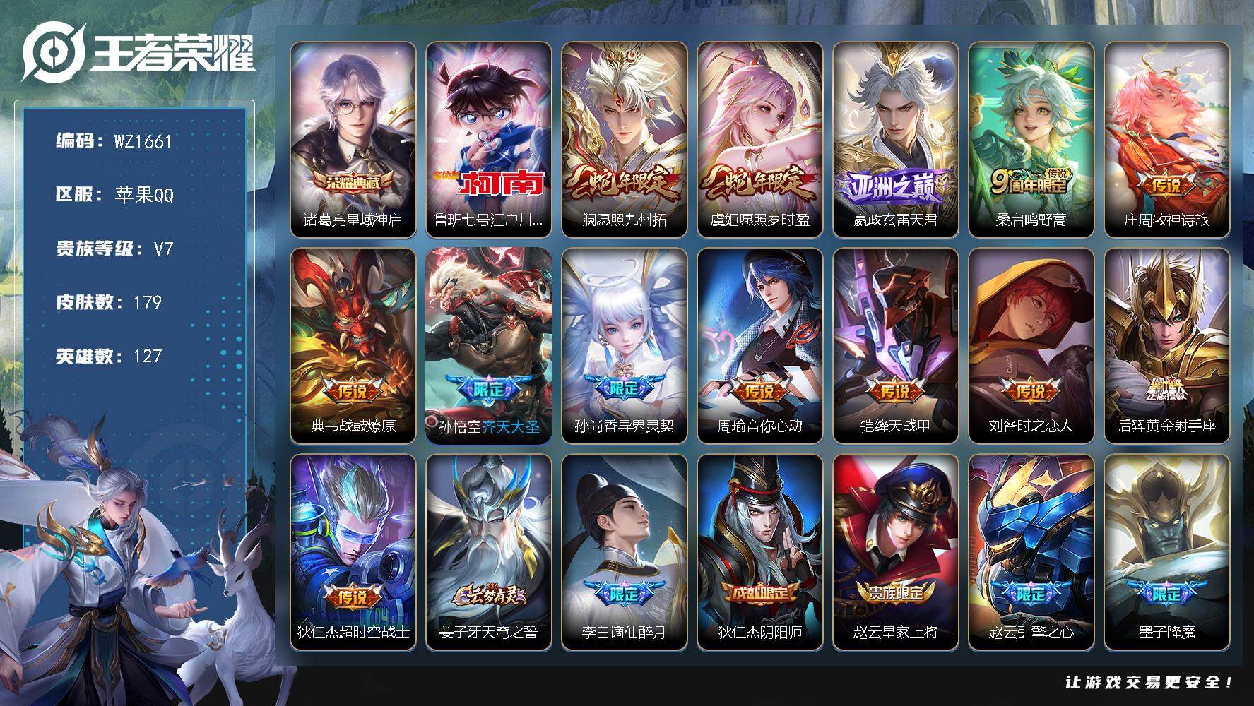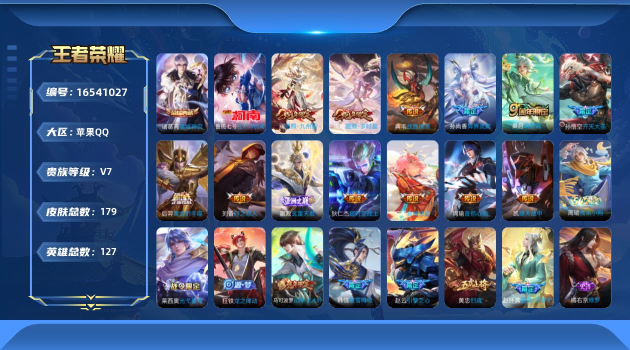[16541027]苹果Q-179皮肤-1典藏皮肤-1珍品传说-13传说-50史诗 【英雄全皮】:孙权全皮,影全皮 【荣耀典藏】:诸葛亮星域神启 【珍品传说】:鲁班七号江户川柯南 【传说皮肤】:澜愿照九州拓,虞姬愿照岁时盈,嬴政玄雷天君,桑启鸣野蒿,庄周牧神诗旅,典韦战鼓燎原,孙悟空齐天大圣,孙尚香异界灵契,周瑜音你心动,铠绛天战甲,刘备时之恋人,后羿黄金射手座,狄仁杰超时空战士 【限定皮肤】:姜子牙天穹之誓,李白谪仙醉月,狄仁杰阴阳师,赵云皇家上将,赵云引擎之心,墨子降魔,孙尚香异界灵契,高渐离玩趣恶龙,钟无艳超时空战士,吕布猎兽之王,元歌无心,甄姬落雪兰心,马可波罗山海玄木吟,狄仁杰魔术师,狄仁杰万华元夜,项羽海滩派对,韩信傲雪梅枪,王昭君午后时光,孙悟空齐天大圣,后羿圣弓游侠,李元芳云中旅人,鬼谷子五谷丰年,黄忠烈魂,梦奇顽趣,裴擒虎擒涛扼浪,嫦娥拒霜思,嫦娥暖冬兔眠,鲁班大师探海日志,桑启海盐诗旅,暃星界游侠,艾琳流音漫舞,阿古朵江河有灵,张良古海寻踪,高渐离燃音魔法,妲己灵卜魔法,鬼谷子天穹祈灯,百里玄策超元猎域,沈梦溪龙舞盛年,鲁班七号蔬乡物语,李元芳蔬乡物语,刘邦剑破天穹,周瑜熔金海岸 【年限皮肤】:马可波罗山海玄木吟,澜愿照九州拓,虞姬愿照岁时盈 【赛季限定】:狄仁杰万华元夜,李元芳云中旅人,桑启海盐诗旅,裴擒虎擒涛扼浪,鲁班大师探海日志,张良古海寻踪,鬼谷子天穹祈灯,刘邦剑破天穹,姜子牙天穹之誓,东皇太一噬灭天穹,太乙真人谧流熔炉,梦奇顽趣 【战令限定】:吕布猎兽之王,后羿圣弓游侠,王昭君午后时光,钟无艳超时空战士,甄姬落雪兰心,暃星界游侠,嫦娥暖冬兔眠,艾琳流音漫舞,高渐离燃音魔法,妲己灵卜魔法,鲁班七号蔬乡物语,李元芳蔬乡物语,亚连破空之剑,廉颇撼地雄心,孙悟空神迹守卫,百里守约百相守梦,老夫子百相守梦,孙膑茶境仙,马超访茗客,莱西奥光弋星穹,明世隐往忆晖光,周瑜线条小狗 【史诗皮肤】:赵云皇家上将,赵云未来纪元,甄姬冰雪圆舞曲,王昭君偶像歌手,狄仁杰魔术师,宫本武藏鬼剑武藏,孙尚香水果甜心,嬴政摇滚巨星,妲己魅力维加斯,墨子龙骑士,刘禅绅士熊喵,曹操幽灵船长,张飞乱世虎臣,赵云引擎之心,兰陵王暗隐猎兽者,亚瑟心灵战警,雅典娜冰冠公主,安琪拉心灵骇客,百里守约特工魅影,李元芳逐浪之夏,白起星夜王子,阿轲节奏热浪,孙策猫狗日记,伽罗箭羽风息,狄仁杰鹰眼统帅,橘右京