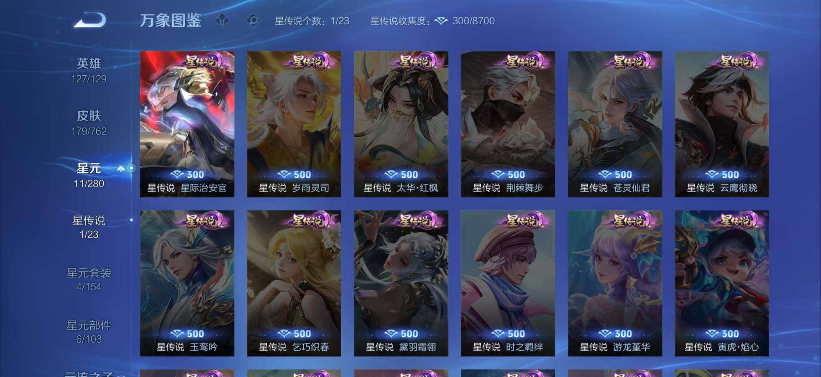 【限定皮肤】:姜子牙天穹之誓,李白谪仙醉月,狄仁杰阴阳师,赵云皇家上将,赵云引擎之心,墨子降魔,孙尚香异界灵契,高渐离玩趣恶龙,钟无艳超时空战士,吕布猎兽之王,元歌无心,甄姬落雪兰心,马可波罗山海玄木吟,狄仁杰魔术师,狄仁杰万华元夜,项羽海滩派对,韩信傲雪梅枪,王昭君午后时光,孙悟空齐天大圣,后羿圣弓游侠,李元芳云中旅人,鬼谷子五谷丰年,黄忠烈魂,梦奇顽趣,裴擒虎擒涛扼浪,嫦娥拒霜思,嫦娥暖冬兔眠,鲁班大师探海日志,桑启海盐诗旅,暃星界游侠,艾琳流音漫舞,阿古朵江河有灵,张良古海寻踪,高渐离燃音魔法,妲己灵卜魔法,鬼谷子天穹祈灯,百里玄策超元猎域,沈梦溪龙舞盛年,鲁班七号蔬乡物语,李元芳蔬乡物语,刘邦剑破天穹,周瑜熔金海岸