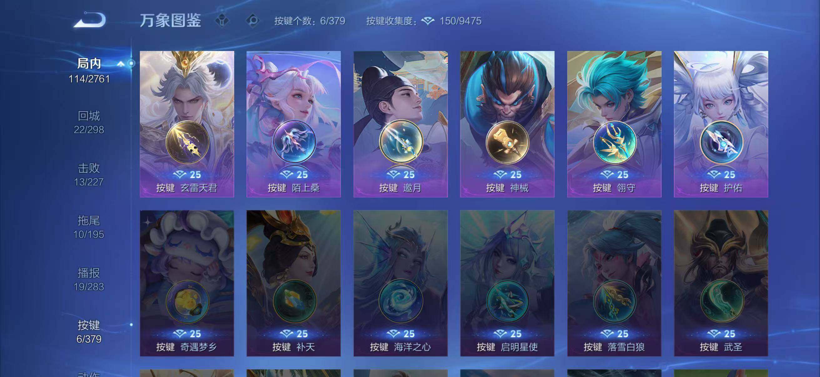 【赛季限定】:狄仁杰万华元夜,李元芳云中旅人,桑启海盐诗旅,裴擒虎擒涛扼浪,鲁班大师探海日志,张良古海寻踪,鬼谷子天穹祈灯,刘邦剑破天穹,姜子牙天穹之誓,东皇太一噬灭天穹,太乙真人谧流熔炉,梦奇顽趣