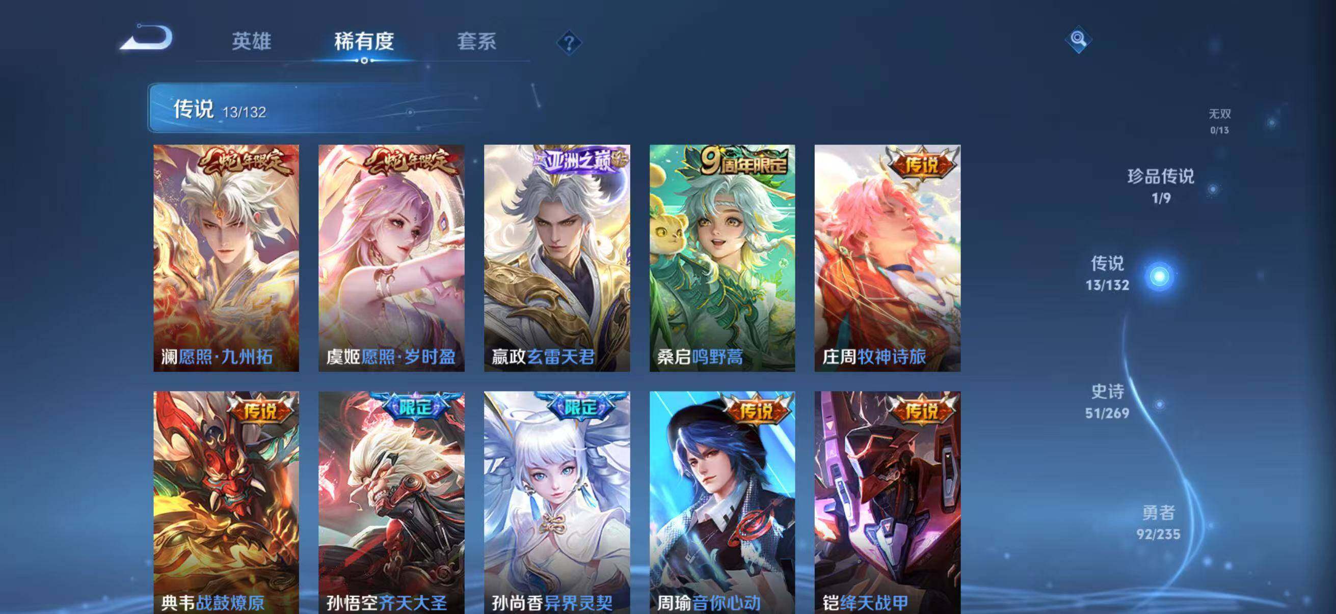 【传说皮肤】:澜愿照九州拓,虞姬愿照岁时盈,嬴政玄雷天君,桑启鸣野蒿,庄周牧神诗旅,典韦战鼓燎原,孙悟空齐天大圣,孙尚香异界灵契,周瑜音你心动,铠绛天战甲,刘备时之恋人,后羿黄金射手座,狄仁杰超时空战士