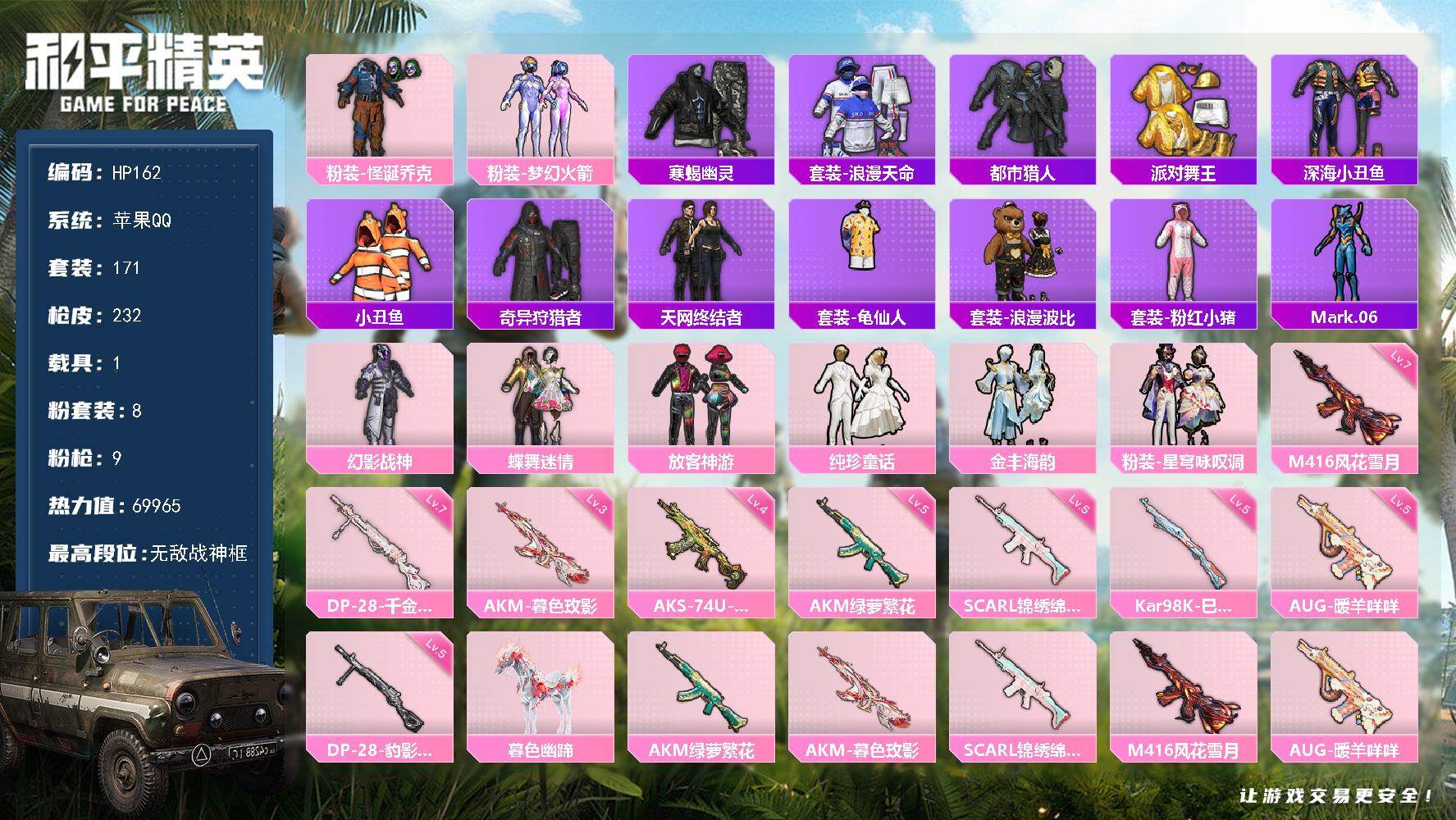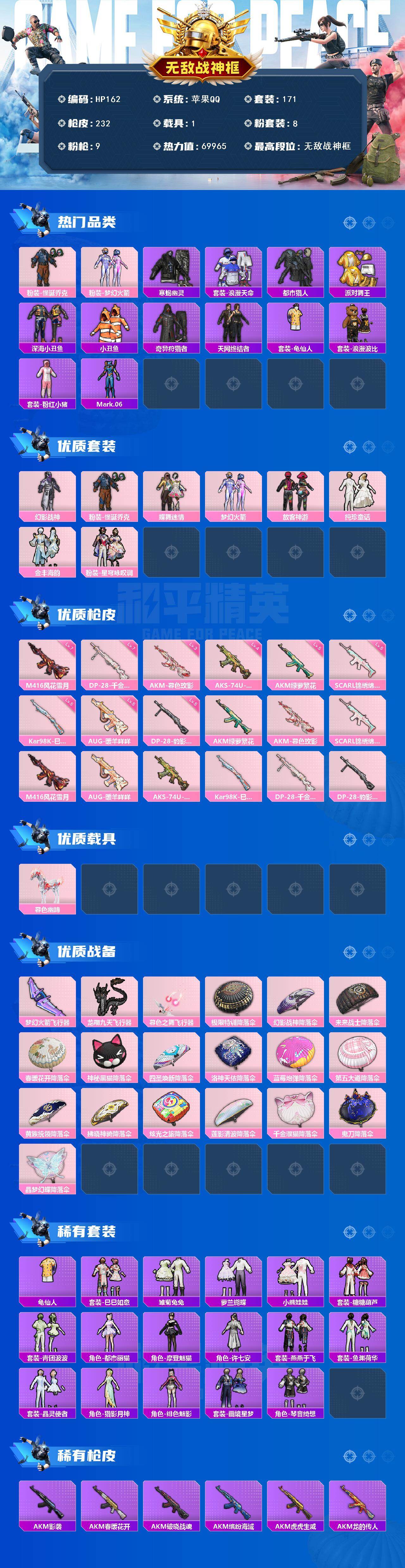 [16541360]苹果 手Q-无敌战神框-8粉装-9特效枪-1载具-4粉色飞行器-69965热力值-7王牌印记-171套装-232枪皮