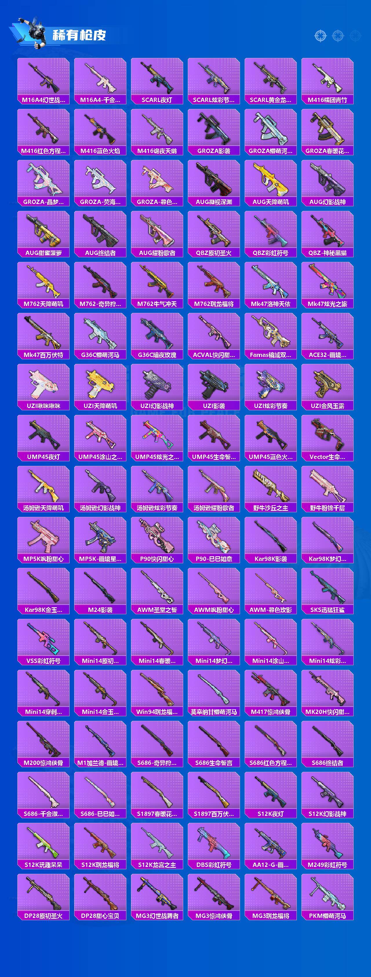 【稀有枪皮】:AUG-冰晶雪宝,AKM-影袭,AKM-春暖花开,AKM-破晓战魂,AKM-缤纷海域,AKM-虎虎生威,AKM-龙的传人,M16A4-幻世战舞者,M16A4-千金淑猫,SCAR-L-夜灯,SCAR-L-炫彩节奏,SCAR-L-黄金龙骨,M416-糯团青竹,M416-红色方程式,M416-蓝色火焰,M4
