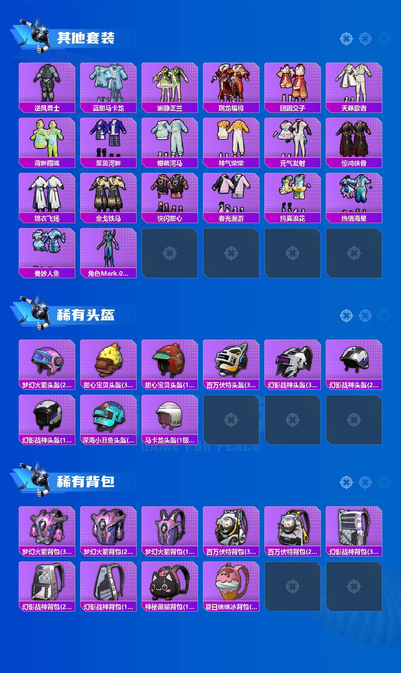 套装-怪诞乔克,套装-梦幻火箭,套装-寒蝎幽灵,套装-都市猎人,套装-派对舞王,套装-深海小丑鱼,套装-奇异狩猎者,套装-浪漫波比,套装-幻影战神,套装-蝶舞迷情,套装-放客神游,套装-纯珍童话,套装-金丰海韵,套装-鹰眼刺客,套装-迅捷狂鲨