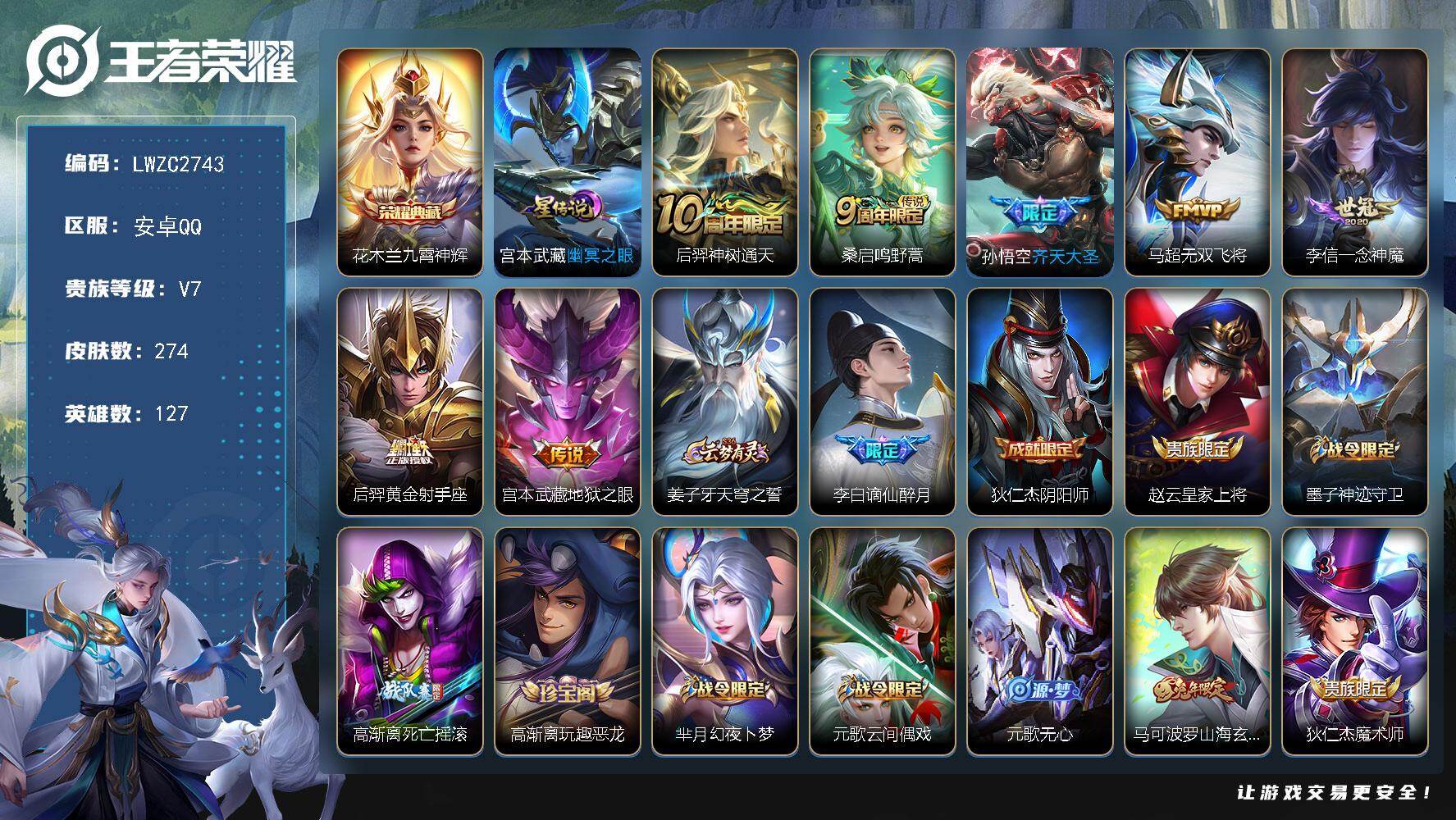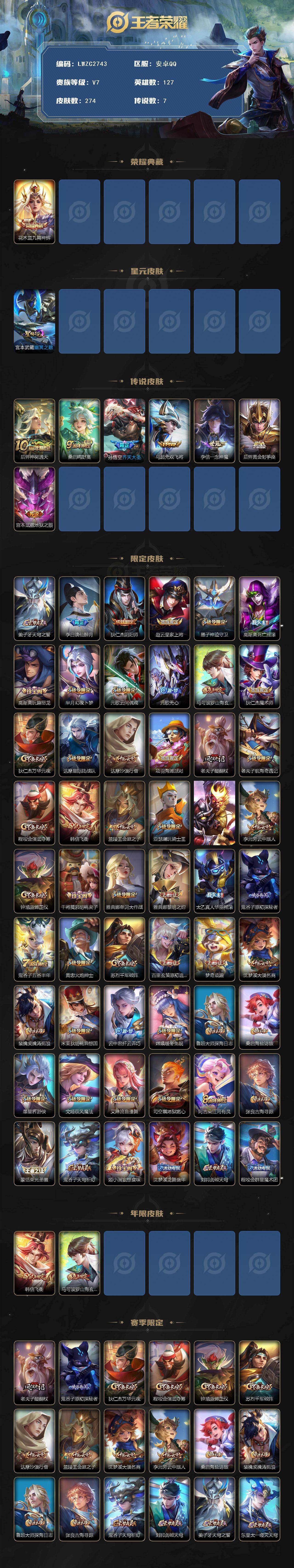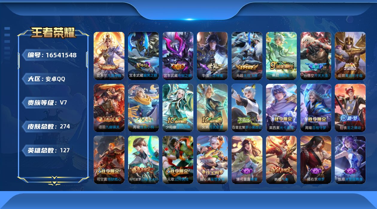 [16541548]【特价出售/店主推荐安卓】安卓Q-V7-至尊星耀IV段位-127英雄-274皮肤-1星传说-1典藏皮肤-7传说-72史诗