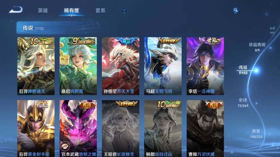 【传说皮肤】:后羿神树通天,桑启鸣野蒿,孙悟空齐天大圣,马超无双飞将,李信一念神魔,后羿黄金射手座,宫本武藏地狱之眼