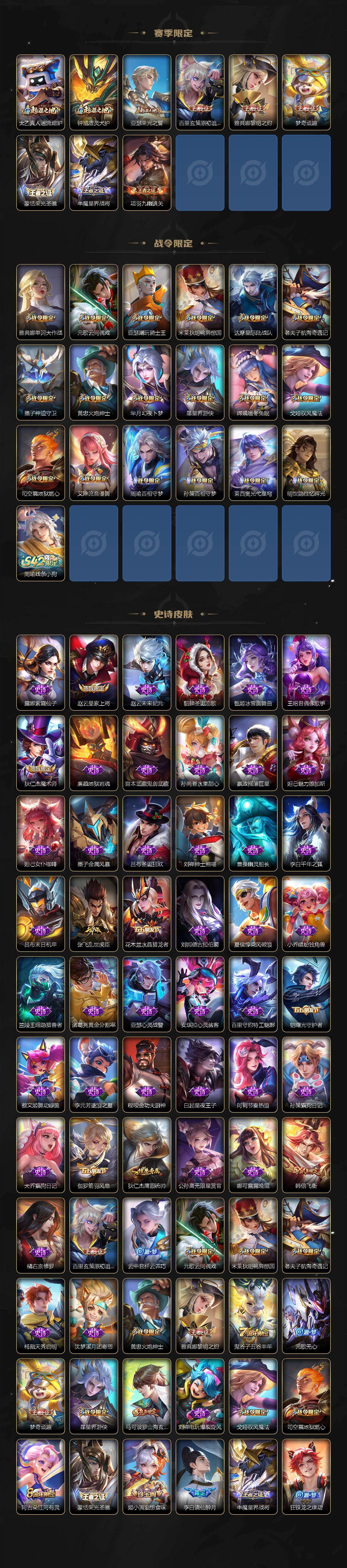 【赛季限定】:老夫子醍醐杖,鬼谷子原初探秘者,狄仁杰万华元夜,程咬金演武夺筹,钟馗驱傩正仪,苏烈千军破阵,达摩沙漠行僧,兰陵王金庭之子,沈梦溪大漠名商,李元芳云中旅人,桑启海盐诗旅,裴擒虎擒涛扼浪,鲁班大师探海日志,张良古海寻踪,鬼谷子天穹祈灯,刘邦剑破天穹,姜子牙天穹之誓,东皇太一噬灭天穹,太乙真人谧流熔炉,钟馗虚灵犬护,亚瑟荣光之誓,百里玄策原初追逐者,雅典娜黎明之约,梦奇顽趣,蒙恬荣光圣徽,牛魔星界战将,项羽九幽镇关