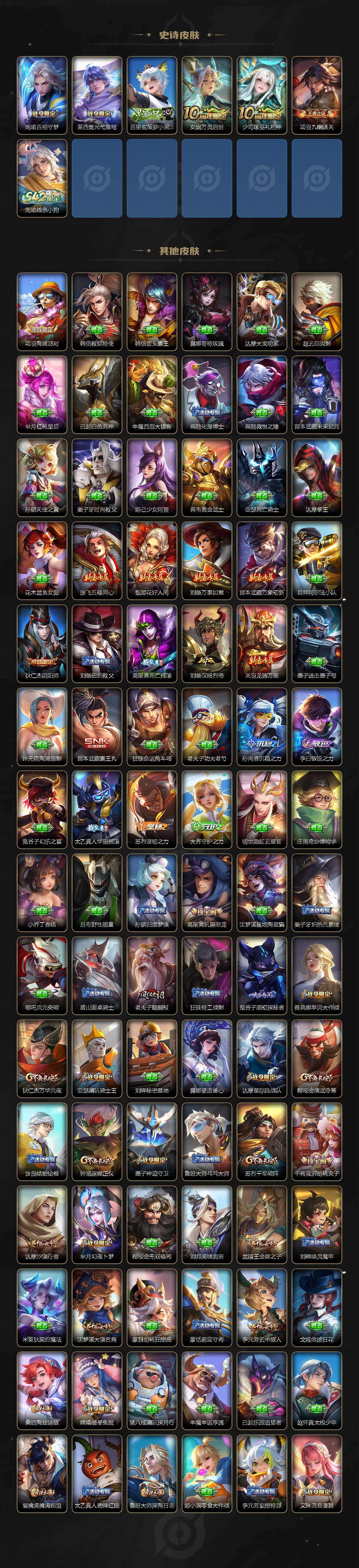 【限定皮肤】:姜子牙天穹之誓,李白谪仙醉月,狄仁杰阴阳师,赵云皇家上将,墨子神迹守卫,高渐离死亡摇滚,高渐离玩趣恶龙,芈月幻夜卜梦,元歌云间偶戏,元歌无心,马可波罗山海玄木吟,狄仁杰魔术师,狄仁杰万华元夜,达摩星际陆战队,达摩沙漠行僧,项羽海滩派对,老夫子醍醐杖,老夫子航海奇遇记,程咬金演武夺筹,韩信飞衡,兰陵王金庭之子,亚瑟潮玩骑士王,孙悟空齐天大圣,李元芳云中旅人,钟馗驱傩正仪,干将莫邪胡桃夹子,雅典娜单词大作战,雅典娜黎明之约,太乙真人华丽摇滚,鬼谷子原初探秘者,鬼谷子五谷丰年,黄忠火炮绅士,苏烈千军破阵,百里玄策原初追逐者,梦奇顽趣,沈梦溪大漠名商,裴擒虎擒涛扼浪,米莱狄胡桃异想国,云中君纤云弄巧,嫦娥暖冬兔眠,鲁班大师探海日志,桑启海盐诗旅,暃星界游侠,戈娅驭风魔法,艾琳流音漫舞,司空震地狱燃心,阿古朵江河有灵,张良古海寻踪,蒙恬荣光圣徽,鬼谷子天穹祈灯,姬小满妄想食味,沈梦溪龙舞盛年,刘邦剑破天穹,程咬金群星魔术团