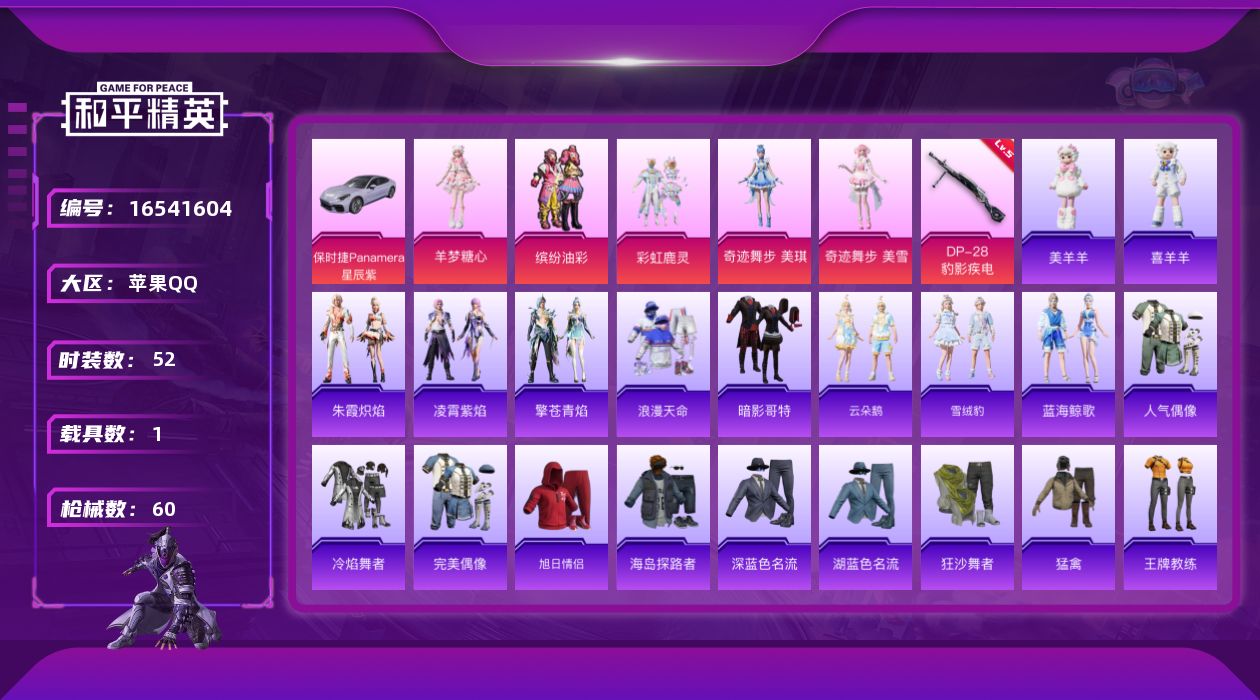 [16541604]苹果 手Q-5粉装-1特效枪-1载具-2粉色飞行器-18189热力值-2王牌印记-52套装-60枪皮