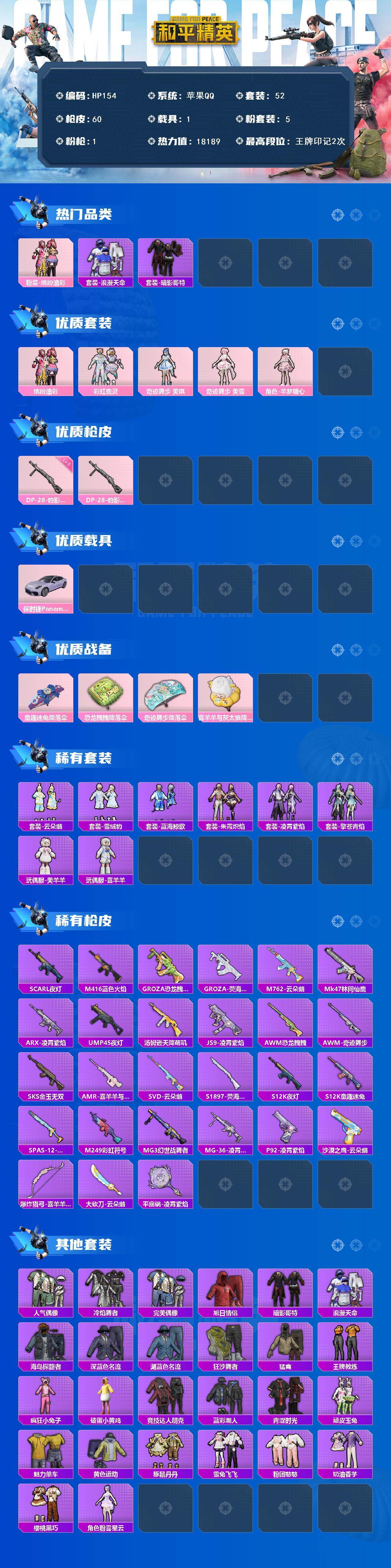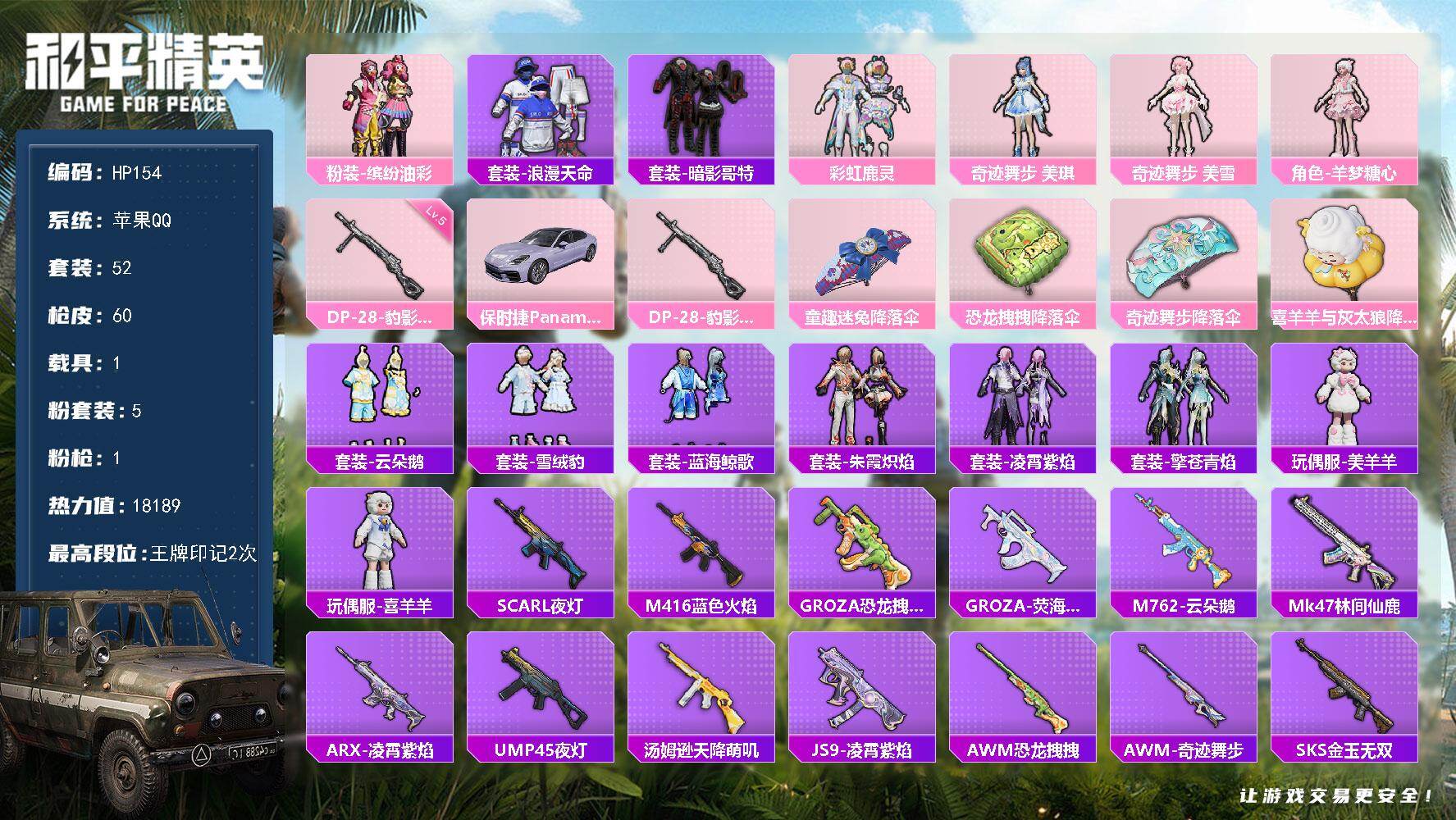 [16541604]苹果 手Q-5粉装-1特效枪-1载具-2粉色飞行器-18189热力值-2王牌印记-52套装-60枪皮 【热门品类】:粉装-缤纷油彩,套装-浪漫天命,套装-暗影哥特 【粉色套装】:粉装-缤纷油彩,粉装-彩虹鹿灵,角色-奇迹舞步 美琪,角色-奇迹舞步 美雪,角色-羊梦糖心 【粉色枪皮等级】:DP-28-豹影疾电(五级) 【粉色载具】:保时捷Panamera(星辰紫) 【粉色枪皮】:DP-28-豹影疾电 【粉色降落伞】:童趣迷兔降落伞,恐龙拽拽降落伞,奇迹舞步降落伞,喜羊羊与灰太狼降落伞,炫彩糖果降落伞 【稀有套装】:套装-炫彩糖果,套装-云朵鹅,套装-雪绒豹,套装-蓝海鲸歌,套装-朱霞炽焰,套装-凌霄紫焰,套装-擎苍青焰,玩偶服-美羊羊,玩偶服-喜羊羊 【稀有枪皮】:SCAR-L-夜灯,M416-蓝色火焰,GROZA-恐龙拽拽,GROZA-荧海星豚,M762-云朵鹅,Mk47-林间仙鹿,ARX-凌霄紫焰,UMP45-夜灯,汤姆逊-天降萌叽,JS9-凌霄紫焰,AWM-恐龙拽拽,AWM-奇迹舞步,SKS-金玉无双,AMR-喜羊羊与灰太狼,SVD-云朵鹅,S1897-荧海星豚,S12K-童趣迷兔,S12K-夜灯,SPAS-12-云朵鹅,M249-彩虹符号,MG3-幻世战舞者,MG-36-凌霄紫焰,P92-凌霄紫焰,沙漠之鹰-云朵鹅,爆炸猎弓-喜羊羊与灰太狼,大砍刀-云朵鹅,平底锅-凌霄紫焰 【其他套装】:套装-人气偶像,套装-冷焰舞者,套装-完美偶像,套装-旭日情侣,套装-暗影哥特,套装-浪漫天命,套装-海岛探路者,套装-深蓝色名流,套装-湖蓝色名流,套装-狂沙舞者,套装-猛禽,套装-王牌教练,套装-疯狂小兔子,套装-破蛋小黄鸡,套装-竞技达人朋克,套装-蓝彩潮人,套装-青涩时光,套装-顽皮玉兔,套装-魅力单车,套装-黄色运动,套装-豚鼠丹丹,套装-雪兔飞飞,套装-粉团憨憨,套装-奶油香芋,套装-樱桃黑巧,角色-粉雾星云 【稀有背包】:深海小丑鱼背包(3级) 【营地ID】:1015907306