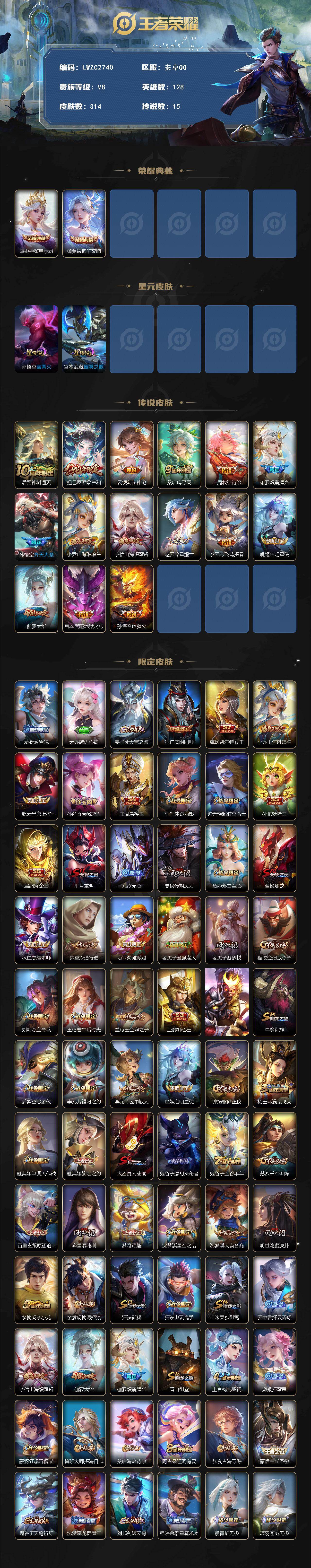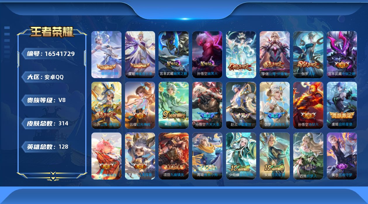 [16541729]【店主推荐捡漏号!可直接换绑】安卓Q-V8-最强王者段位-128英雄-314皮肤-2典藏皮肤-15传说-76史诗-2星元 【英雄全皮】:孙权全皮,空空儿全皮,影全皮 【荣耀典藏】:虞姬神鉴启示录,伽罗最初的交响 【传说皮肤】:后羿神树通天,妲己愿照众生和,云缨幻光神枪,桑启鸣野蒿,庄周牧神诗旅,伽罗炽翼辉光,孙悟空齐天大圣,小乔山海琳琅生,李信山海炽霜斩,赵云淬星耀世,李元芳飞鸢探春,虞姬启明星使,伽罗太华,宫本武藏地狱之眼,孙悟空地狱火 【限定皮肤】:蒙犽顽岩魄,大乔绒语心约,姜子牙天穹之誓,狄仁杰阴阳师,虞姬凯尔特女王,小乔山海琳琅生,赵云皇家上将,孙尚香蔷薇恋人,庄周蜃楼王,阿轲迷踪丽影,钟无艳超时空战士,孙膑妖精王,扁鹊炼金王,芈月重明,元歌无心,夏侯惇朔风刀,甄姬落雪兰心,曹操烛龙,狄仁杰魔术师,达摩沙漠行僧,项羽海滩派对,老夫子圣诞老人,老夫子醍醐杖,程咬金演武夺筹,刘邦夺宝奇兵,王昭君午后时光,兰陵王金庭之子,亚瑟狮心王,孙悟空齐天大圣,牛魔御旌,后羿圣弓游侠,李元芳银河之约,李元芳云中旅人,虞姬启明星使,钟馗驱傩正仪,杨玉环遇见飞天,雅典娜单词大作战,雅典娜黎明之约,太乙真人饕餮,鬼谷子原初探秘者,鬼谷子五谷丰年,苏烈千军破阵,百里玄策原初追逐者,弈星混沌棋,梦奇顽趣,沈梦溪星空之诺,沈梦溪大漠名商,明世隐疑决卦,裴擒虎李小龙,裴擒虎擒涛扼浪,狂铁御狮,狂铁电玩高手,米莱狄御霄,云中君纤云弄巧,李信山海炽霜斩,伽罗太华,伽罗炽翼辉光,盾山御銮,上官婉儿梁祝,嫦娥拒霜思,蒙犽狂想玩偶喵,鲁班大师探海日志,桑启海盐诗旅,阿古朵江河有灵,张良古海寻踪,蒙恬荣光圣徽,鬼谷子天穹祈灯,沈梦溪龙舞盛年,刘邦剑破天穹,程咬金群星魔术团,镜青焰无极,项羽苍威无极,刘备异域游侠,周瑜熔金海岸 【年限皮肤】:伽罗太华,小乔山海琳琅生,李信山海炽霜斩,妲己愿照众生和 【赛季限定】:亚瑟狮心王,庄周蜃楼王,孙膑妖精王,扁鹊炼金王,虞姬凯尔特女王,太乙真人饕餮,曹操烛龙,芈月重明,狂铁御狮,米莱狄御霄,牛魔御旌,盾山御銮,夏侯惇朔风刀,弈星混沌棋,明世隐疑决卦,老夫子醍醐杖,鬼谷子原初探秘者,程咬金演武夺筹,钟馗驱傩正仪,苏烈千军破阵,达摩沙漠行僧,兰陵王金庭之子,沈梦溪大漠名商,李元芳云中旅人,桑启海盐诗旅,裴擒虎擒涛扼浪,鲁班大师探海日志,张良古海寻踪,鬼谷子天穹祈灯,