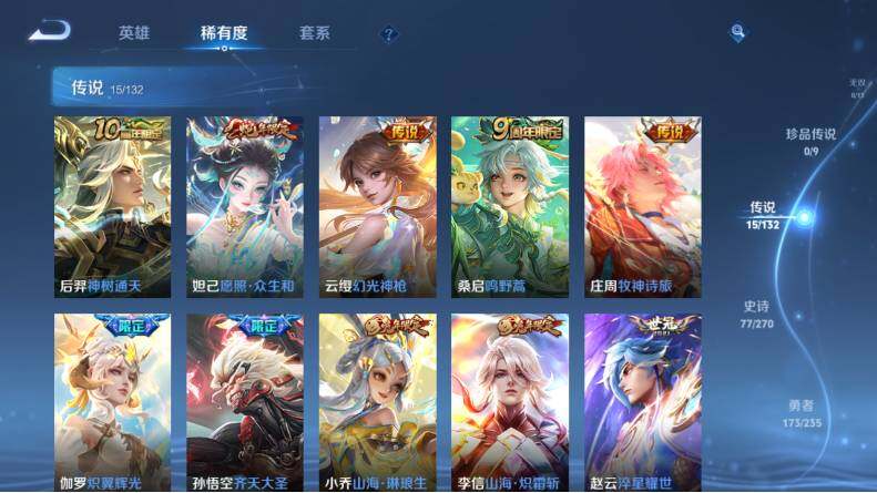 【传说皮肤】:后羿神树通天,妲己愿照众生和,云缨幻光神枪,桑启鸣野蒿,庄周牧神诗旅,伽罗炽翼辉光,孙悟空齐天大圣,小乔山海琳琅生,李信山海炽霜斩,赵云淬星耀世,李元芳飞鸢探春,虞姬启明星使,伽罗太华,宫本武藏地狱之眼,孙悟空地狱火
