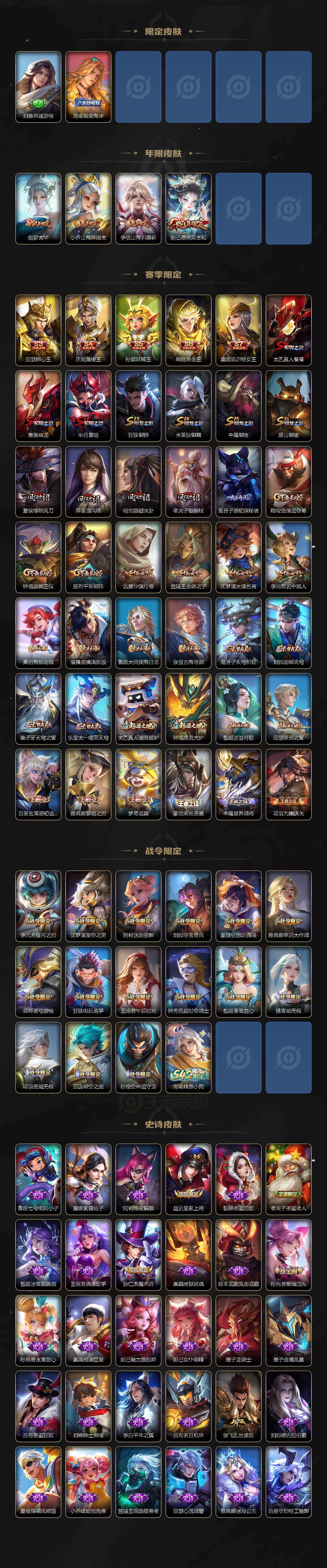 【赛季限定】:亚瑟狮心王,庄周蜃楼王,孙膑妖精王,扁鹊炼金王,虞姬凯尔特女王,太乙真人饕餮,曹操烛龙,芈月重明,狂铁御狮,米莱狄御霄,牛魔御旌,盾山御銮,夏侯惇朔风刀,弈星混沌棋,明世隐疑决卦,老夫子醍醐杖,鬼谷子原初探秘者,程咬金演武夺筹,钟馗驱傩正仪,苏烈千军破阵,达摩沙漠行僧,兰陵王金庭之子,沈梦溪大漠名商,李元芳云中旅人,桑启海盐诗旅,裴擒虎擒涛扼浪,鲁班大师探海日志,张良古海寻踪,鬼谷子天穹祈灯,