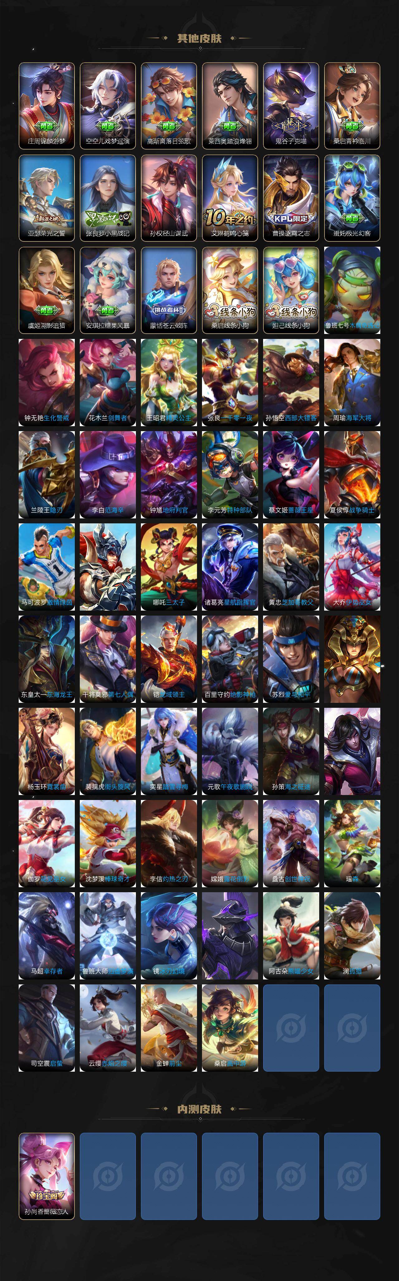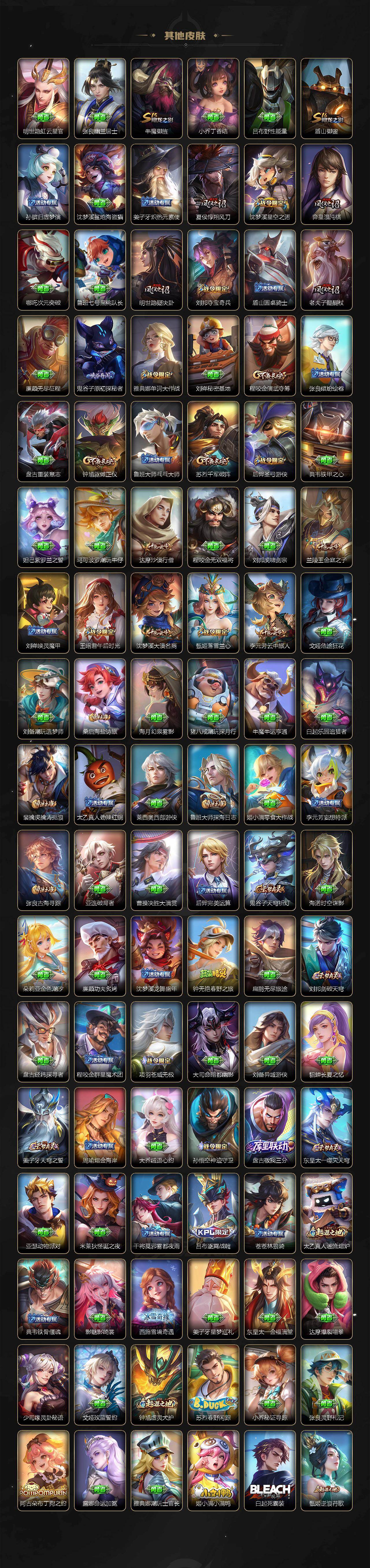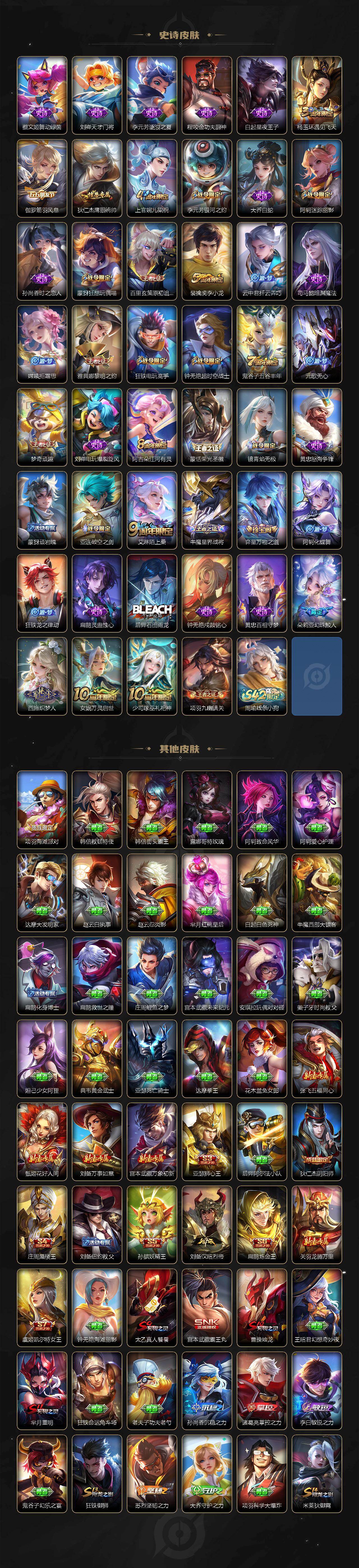 【限定皮肤】:蒙犽顽岩魄,大乔绒语心约,姜子牙天穹之誓,狄仁杰阴阳师,虞姬凯尔特女王,小乔山海琳琅生,赵云皇家上将,孙尚香蔷薇恋人,庄周蜃楼王,阿轲迷踪丽影,钟无艳超时空战士,孙膑妖精王,扁鹊炼金王,芈月重明,元歌无心,夏侯惇朔风刀,甄姬落雪兰心,曹操烛龙,狄仁杰魔术师,达摩沙漠行僧,项羽海滩派对,老夫子圣诞老人,老夫子醍醐杖,程咬金演武夺筹,刘邦夺宝奇兵,王昭君午后时光,兰陵王金庭之子,亚瑟狮心王,孙悟空齐天大圣,牛魔御旌,后羿圣弓游侠,李元芳银河之约,李元芳云中旅人,虞姬启明星使,钟馗驱傩正仪,杨玉环遇见飞天,雅典娜单词大作战,雅典娜黎明之约,太乙真人饕餮,鬼谷子原初探秘者,鬼谷子五谷丰年,苏烈千军破阵,百里玄策原初追逐者,弈星混沌棋,梦奇顽趣,沈梦溪星空之诺,沈梦溪大漠名商,明世隐疑决卦,裴擒虎李小龙,裴擒虎擒涛扼浪,狂铁御狮,狂铁电玩高手,米莱狄御霄,云中君纤云弄巧,李信山海炽霜斩,伽罗太华,伽罗炽翼辉光,盾山御銮,上官婉儿梁祝,嫦娥拒霜思,蒙犽狂想玩偶喵,鲁班大师探海日志,桑启海盐诗旅,阿古朵江河有灵,张良古海寻踪,蒙恬荣光圣徽,鬼谷子天穹祈灯,沈梦溪龙舞盛年,刘邦剑破天穹,程咬金群星魔术团,镜青焰无极,项羽苍威无极,刘备异域游侠,周瑜熔金海岸