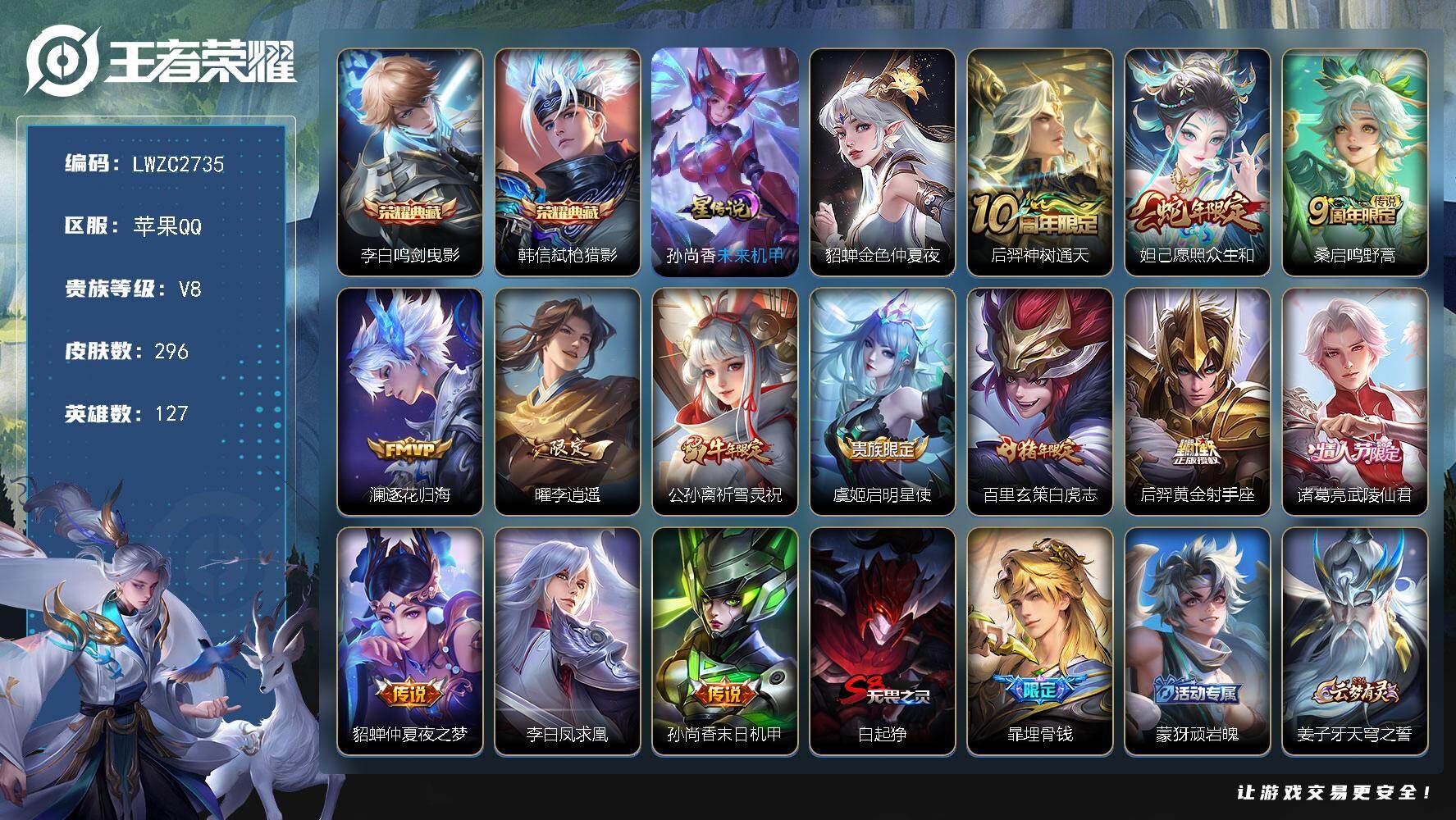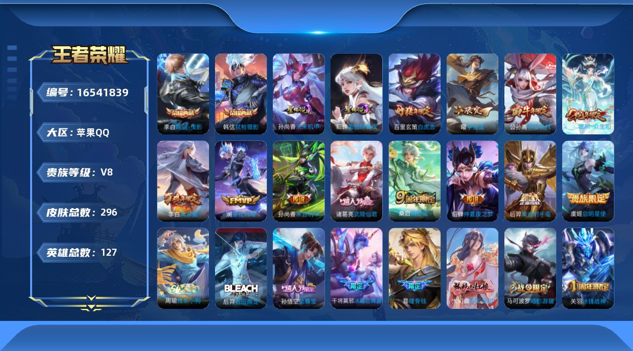 [16541839]可二次【特价出售/店主推荐】金标孙悟空、金标妲己、金标大司命、金标暃、金标项羽、5银标、打野43段,苹果Q-V8-至尊星耀V段位-127英雄-296皮肤-2典藏皮肤-2星传说-13传说-82史诗 【英雄全皮】:影全皮 【荣耀典藏】:李白鸣剑曳影,韩信弑枪猎影 【传说皮肤】:后羿神树通天,妲己愿照众生和,桑启鸣野蒿,澜逐花归海,曜李逍遥 ,公孙离祈雪灵祝,虞姬启明星使,百里玄策白虎志,后羿黄金射手座,诸葛亮武陵仙君,貂蝉仲夏夜之梦,李白凤求凰,孙尚香末日机甲 【限定皮肤】:白起狰,暃埋骨钱,蒙犽顽岩魄,姜子牙天穹之誓,狄仁杰阴阳师,虞姬凯尔特女王,赵云皇家上将,墨子神迹守卫,嬴政优雅恋人,嬴政白昼王子,高渐离死亡摇滚,孙膑妖精王,扁鹊炼金王,芈月重明,芈月幻夜卜梦,吕布猎兽之王,元歌云间偶戏,元歌无心,夏侯惇朔风刀,甄姬游园惊梦,曹操烛龙,典韦穷奇,马可波罗逐梦之星,马可波罗暗影游猎,狄仁杰魔术师,狄仁杰万华元夜,达摩沙漠行僧,项羽海滩派对,老夫子醍醐杖,老夫子航海奇遇记,关羽冰锋战神,程咬金演武夺筹,韩信逐梦之影,韩信飞衡,花木兰青春决赛季,亚瑟潮玩骑士王,孙悟空至尊宝,牛魔御旌,后羿辉光之辰,李元芳银河之约,李元芳云中旅人,虞姬霸王别姬,虞姬启明星使,钟馗驱傩正仪,杨玉环遇见飞天,干将莫邪冰霜恋舞曲,干将莫邪胡桃夹子,雅典娜黎明之约,太乙真人饕餮,鬼谷子原初探秘者,鬼谷子五谷丰年,诸葛亮武陵仙君,黄忠火炮绅士,苏烈千军破阵,百里玄策白虎志,百里玄策原初追逐者,弈星混沌棋,梦奇顽趣,公孙离蜜橘之夏,公孙离祈雪灵祝,沈梦溪星空之诺,沈梦溪大漠名商,明世隐疑决卦,裴擒虎李小龙,裴擒虎擒涛扼浪,狂铁御狮,米莱狄御霄,云中君纤云弄巧,盾山御銮,猪八戒西部大镖客,上官婉儿梁祝,上官婉儿天狼绘梦者,嫦娥拒霜思,曜李逍遥 ,鲁班大师探海日志,桑启海盐诗旅,阿古朵江河有灵,张良古海寻踪,蒙犽百解令,蒙恬荣光圣徽,鬼谷子天穹祈灯,姬小满妄想食味,沈梦溪龙舞盛年,刘邦剑破天穹,程咬金群星魔术团,周瑜熔金海岸 【年限皮肤】:李白凤求凰,后羿辉光之辰,百里玄策白虎志,韩信飞衡,公孙离祈雪灵祝,妲己愿照众生和 【赛季限定】:孙膑妖精王,扁鹊炼金王,虞姬凯尔特女王,白起狰,太乙真人饕餮,曹操烛龙,芈月重明,典韦穷奇,狂铁御狮,米莱狄御霄,牛魔御旌,盾山御銮,夏侯惇朔风刀,弈星混沌棋,明世隐疑