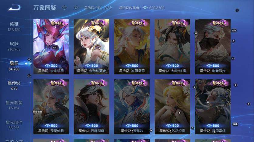 孙膑妖精王,扁鹊炼金王,虞姬凯尔特女王,白起狰,太乙真人饕餮,曹操烛龙,芈月重明,典韦穷奇,狂铁御狮,米莱狄御霄,牛魔御旌,盾山御銮,夏侯惇朔风刀,明世隐疑决卦,老夫子醍醐杖,鬼谷子原初探秘者,狄仁杰万华元夜,程咬金演武夺筹,钟馗驱傩正仪,苏烈千军破阵,吕布猎兽之王,嬴政白昼王子,沈梦溪星空之诺,李元芳银河之约,马可波罗暗影游猎,元歌云间偶戏,弈星混沌棋,达摩沙漠行僧,沈梦溪大漠名商,李元芳云中旅人,桑启海盐诗旅,裴擒虎擒涛扼浪,鲁班大师探海日志,张良古海寻踪