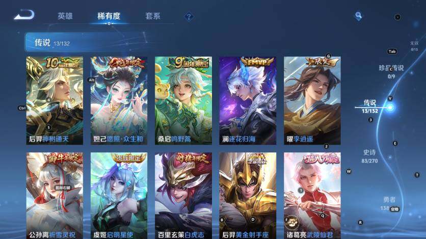 【传说皮肤】:后羿神树通天,妲己愿照众生和,桑启鸣野蒿,澜逐花归海,曜李逍遥 ,公孙离祈雪灵祝,虞姬启明星使,百里玄策白虎志,后羿黄金射手座,诸葛亮武陵仙君,貂蝉仲夏夜之梦,李白凤求凰,孙尚香末日机甲